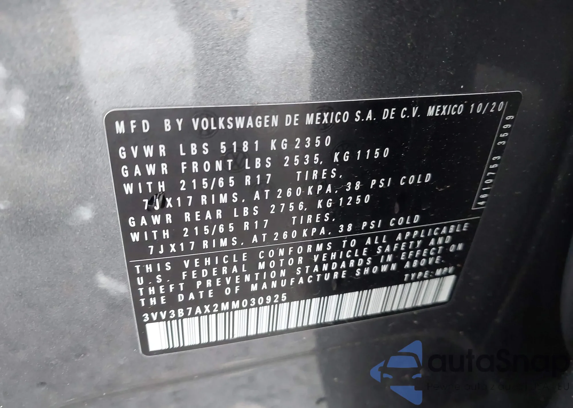 • VIN 3VV3B7AX2MM030925