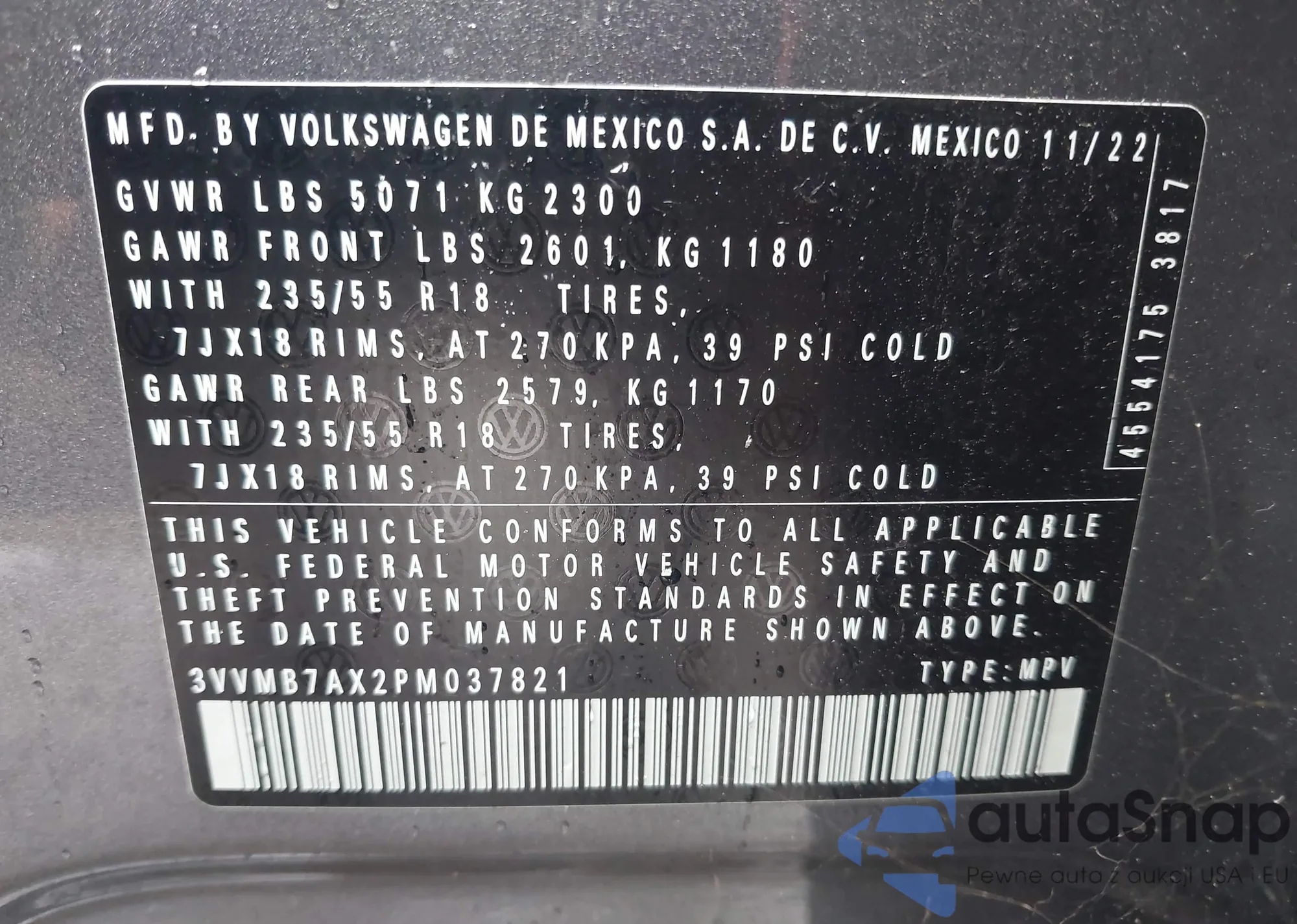 • VIN 3VVMB7AX2PM037821