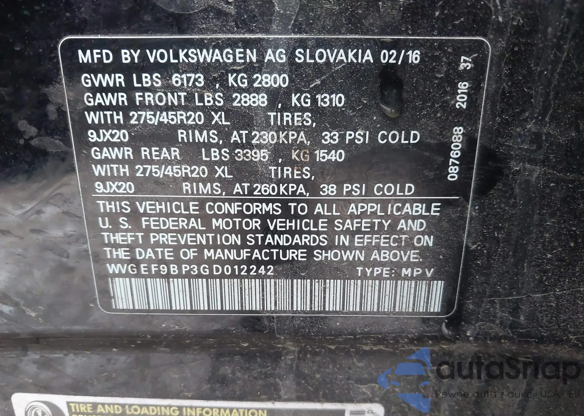 • VIN WVGEF9BP3GD012242