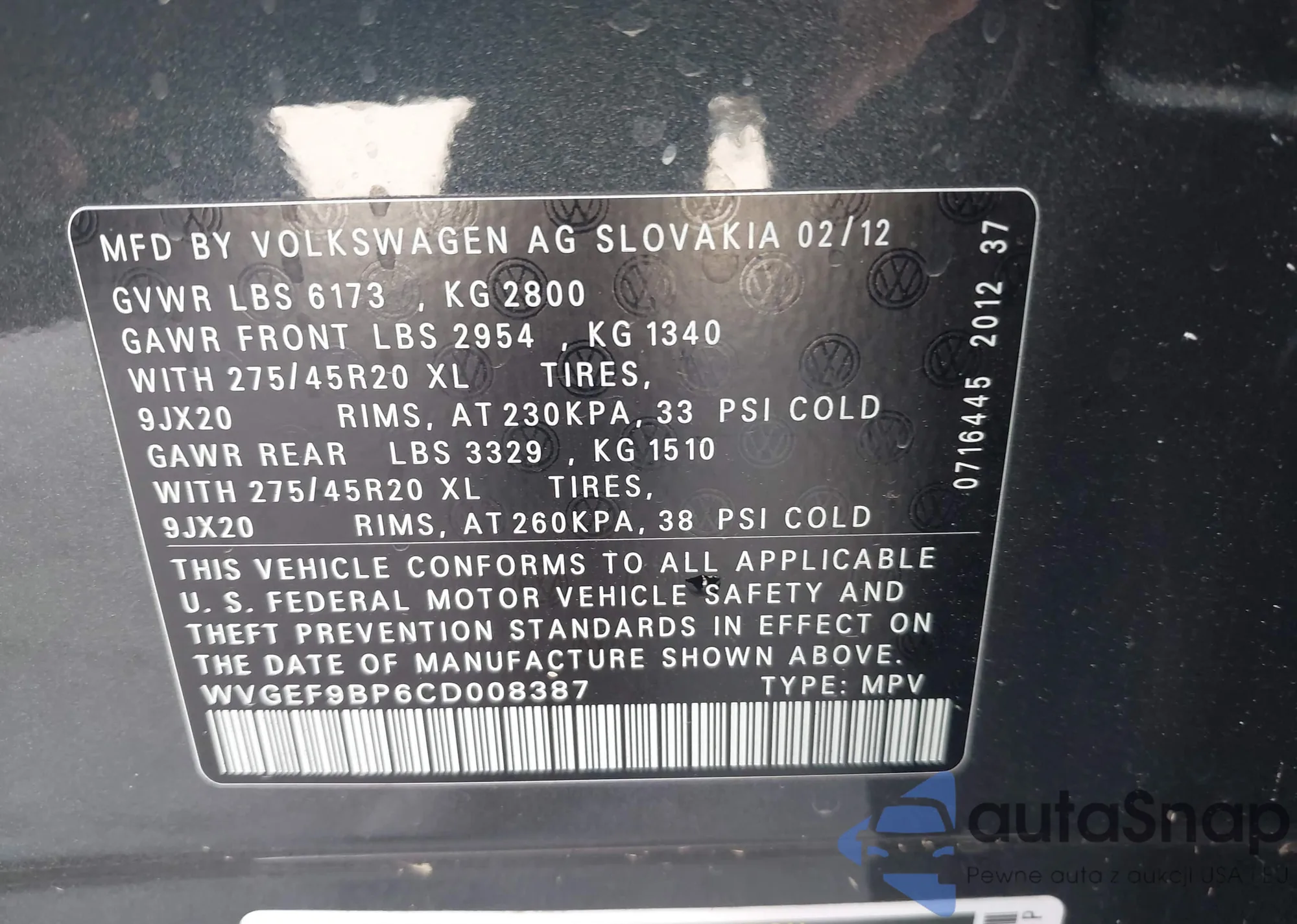 • VIN WVGEF9BP6CD008387