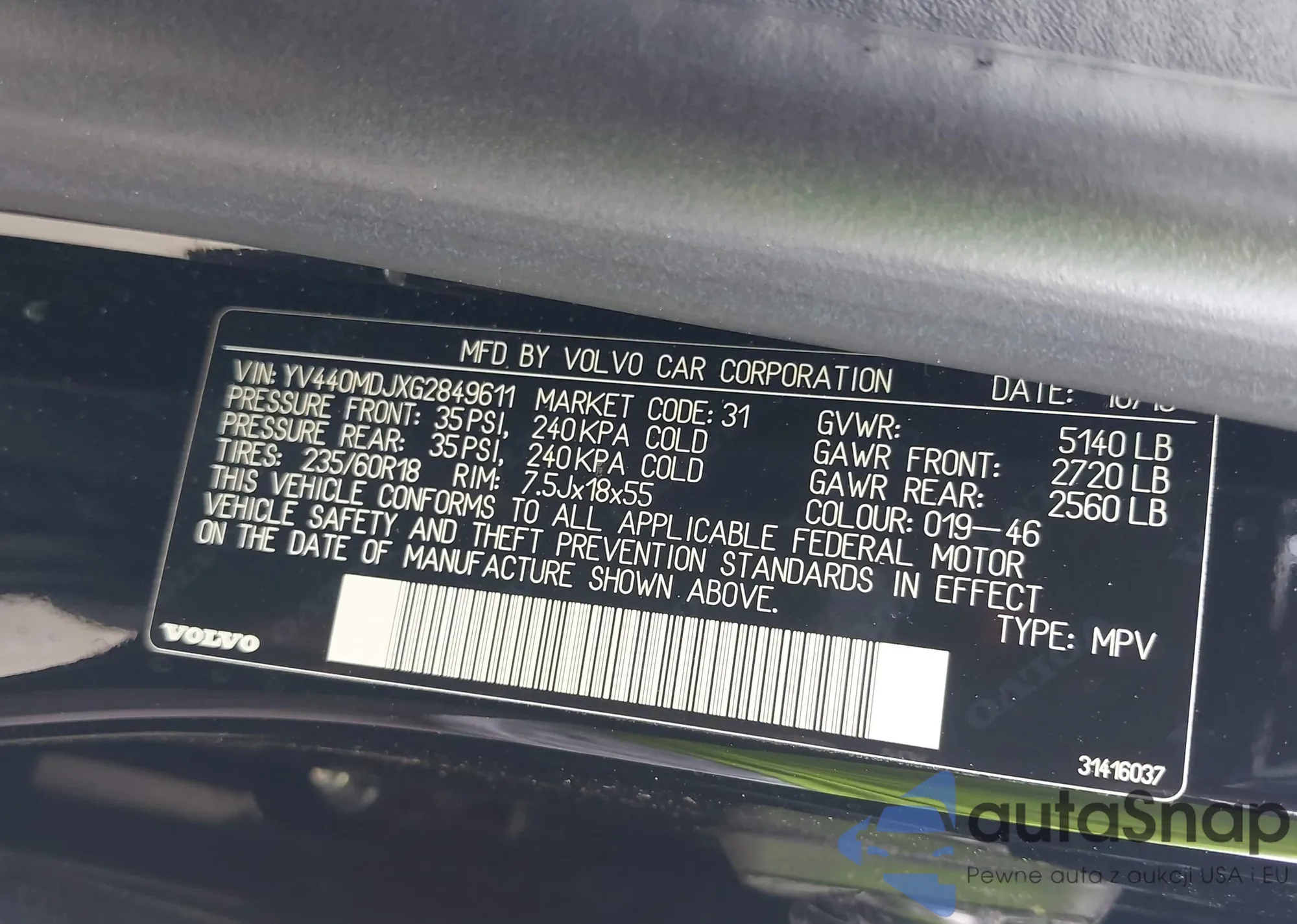 LOT: 43415182 VIN: YV440MDJXG2849611