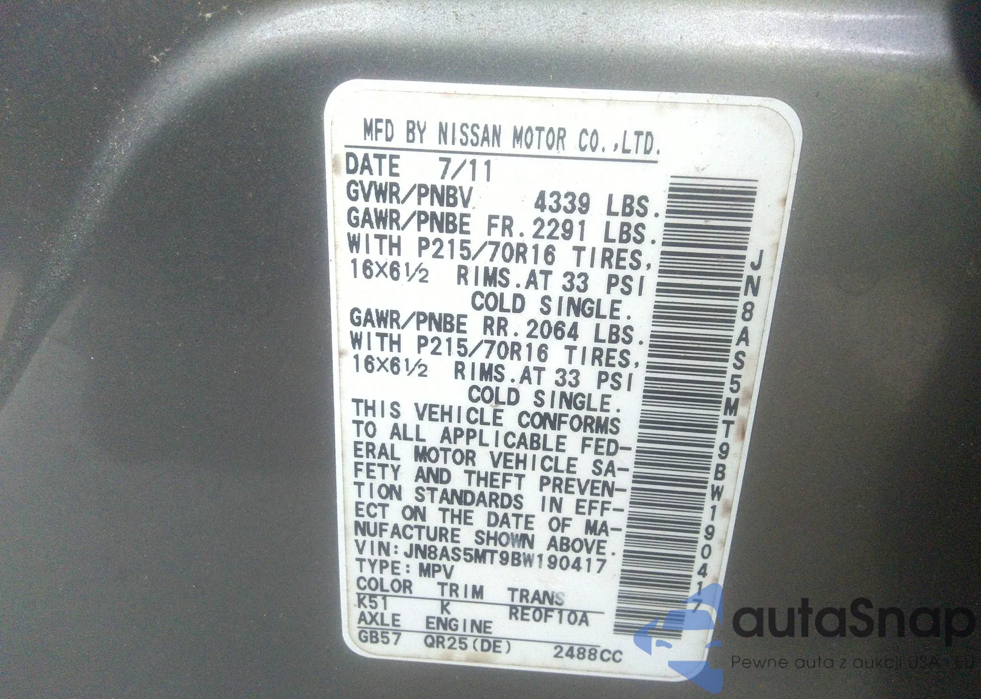 • VIN JN8AS5MT9BW190417