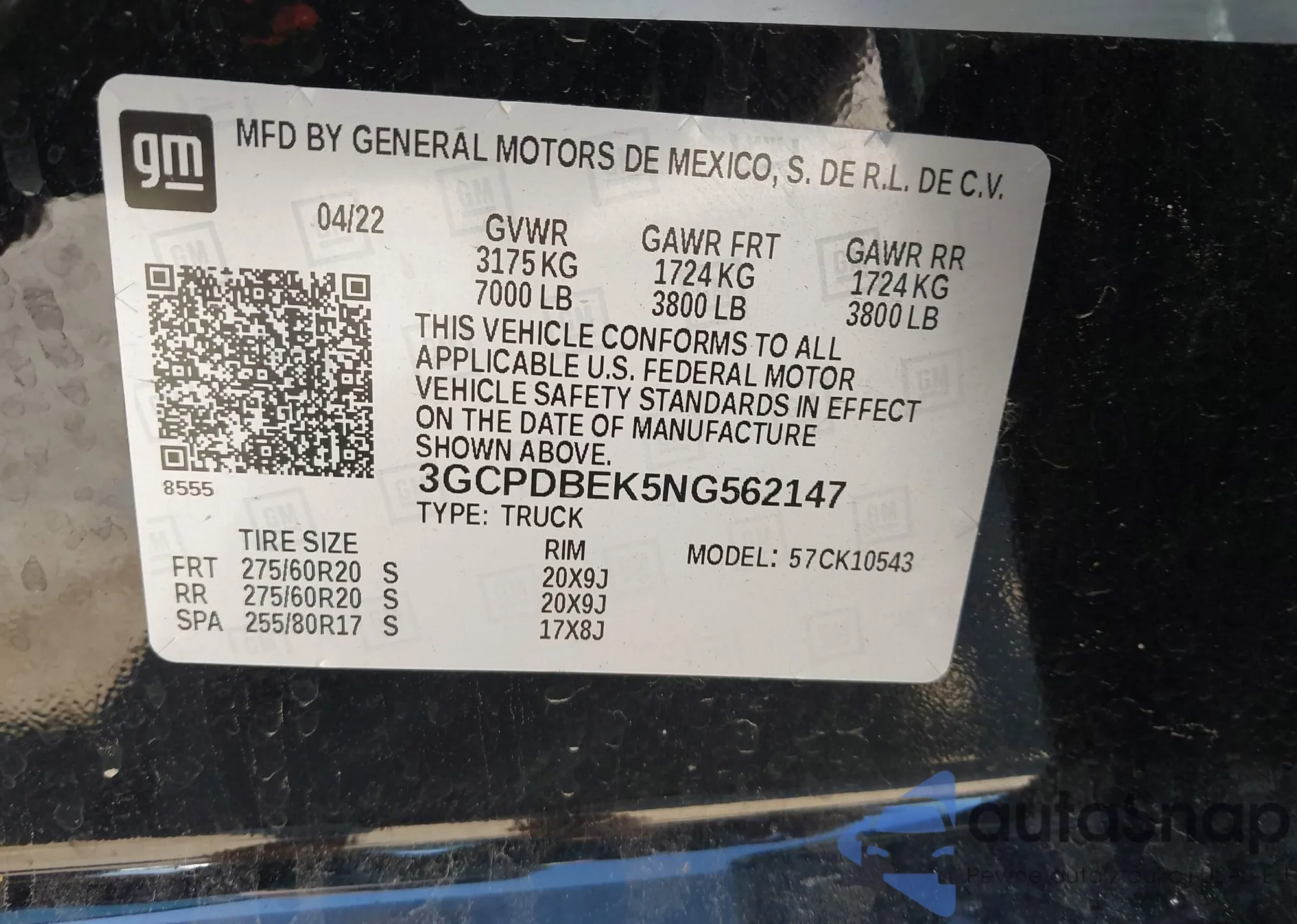 • VIN 3GCPDBEK5NG562147