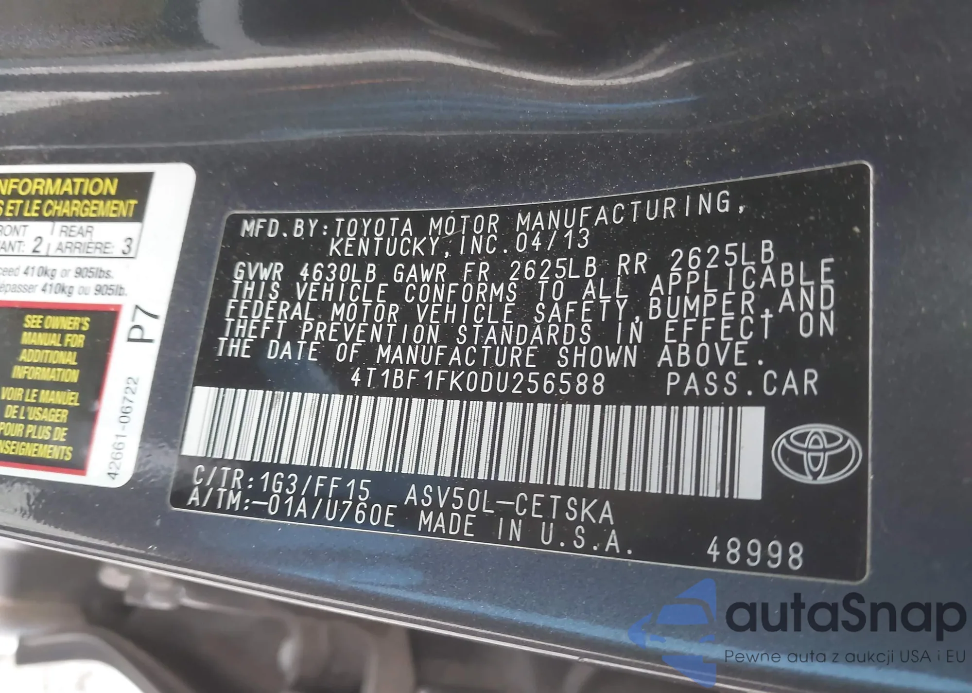 LOT: 41101003 VIN: 4T1BF1FK0DU256588
