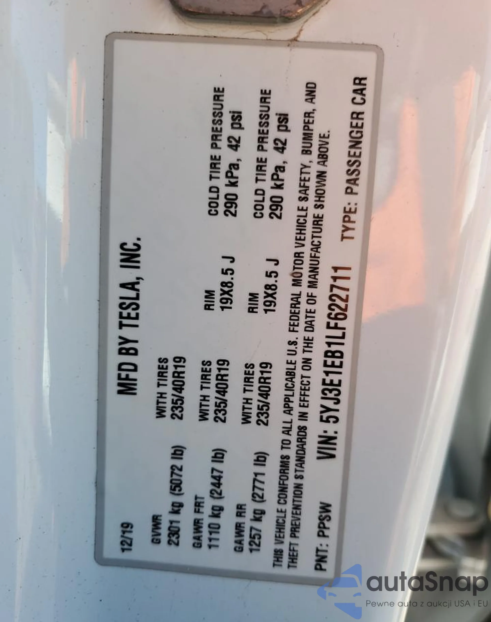 • VIN 5YJ3E1EB1LF622711