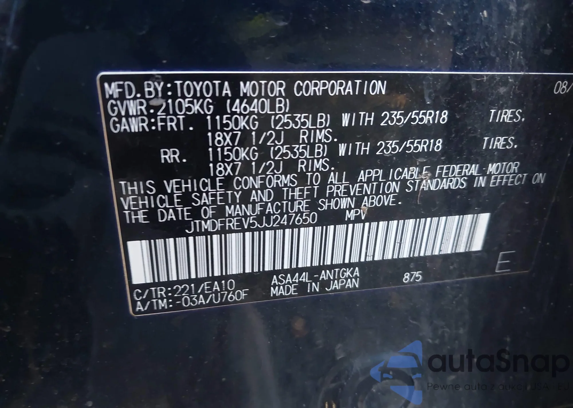 LOT: 40877198 VIN: JTMDFREV5JJ247650