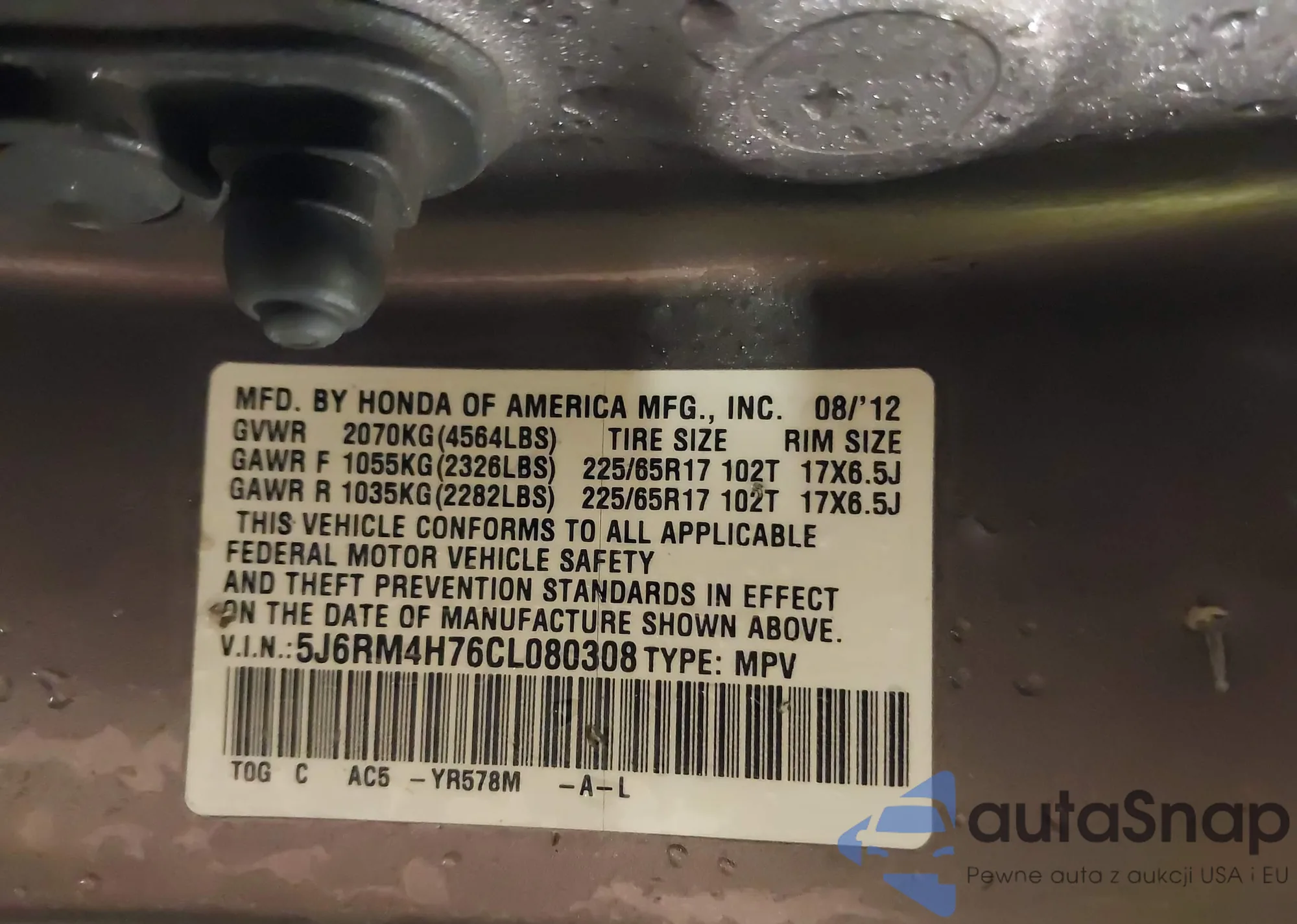 LOT: 41056982 VIN: 5J6RM4H76CL080308