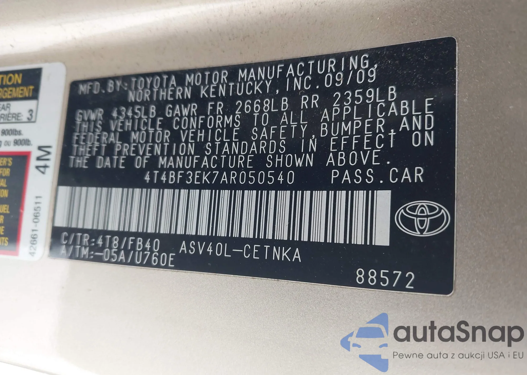 • VIN 4T4BF3EK7AR050540