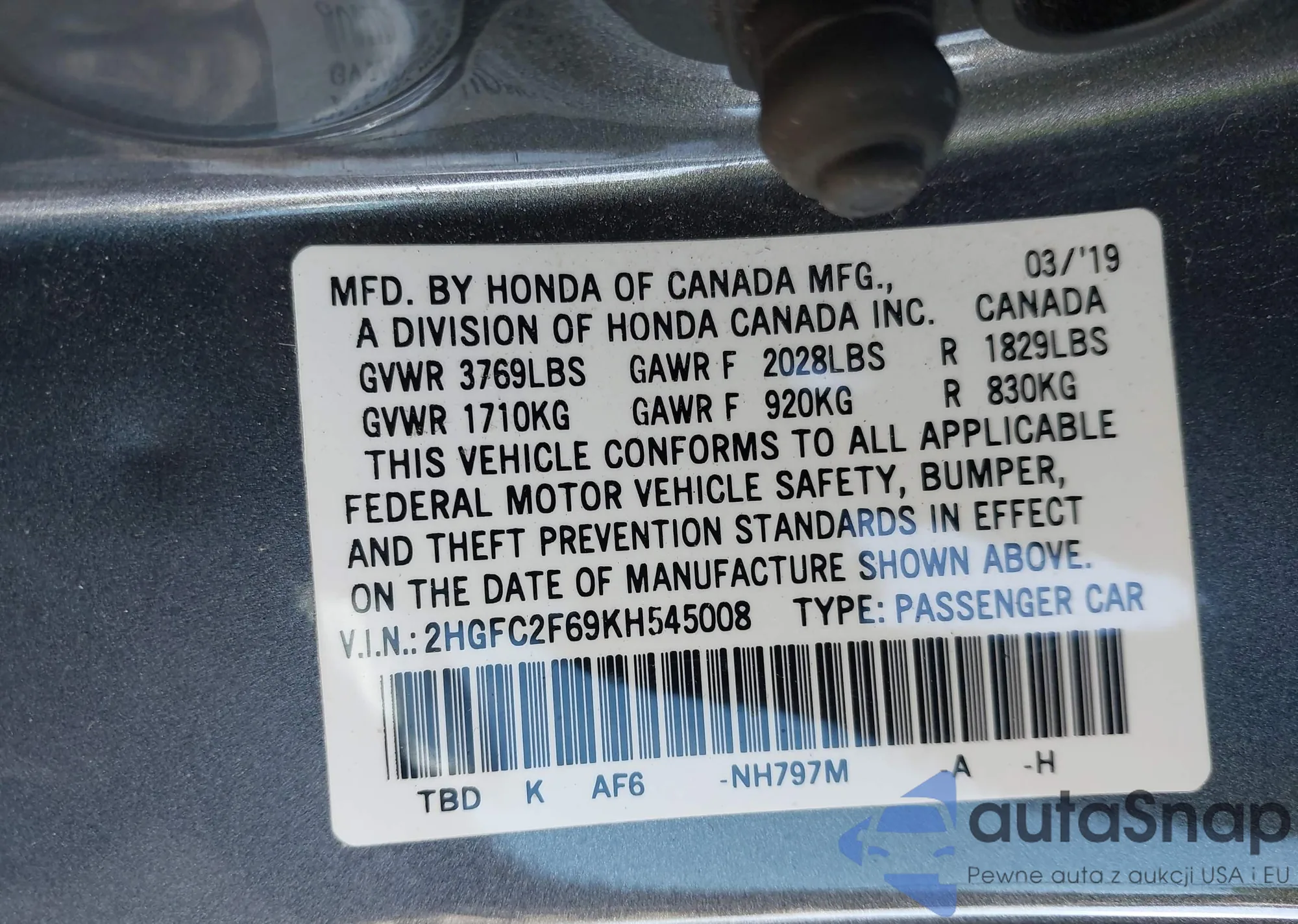 • VIN 2HGFC2F69KH545008