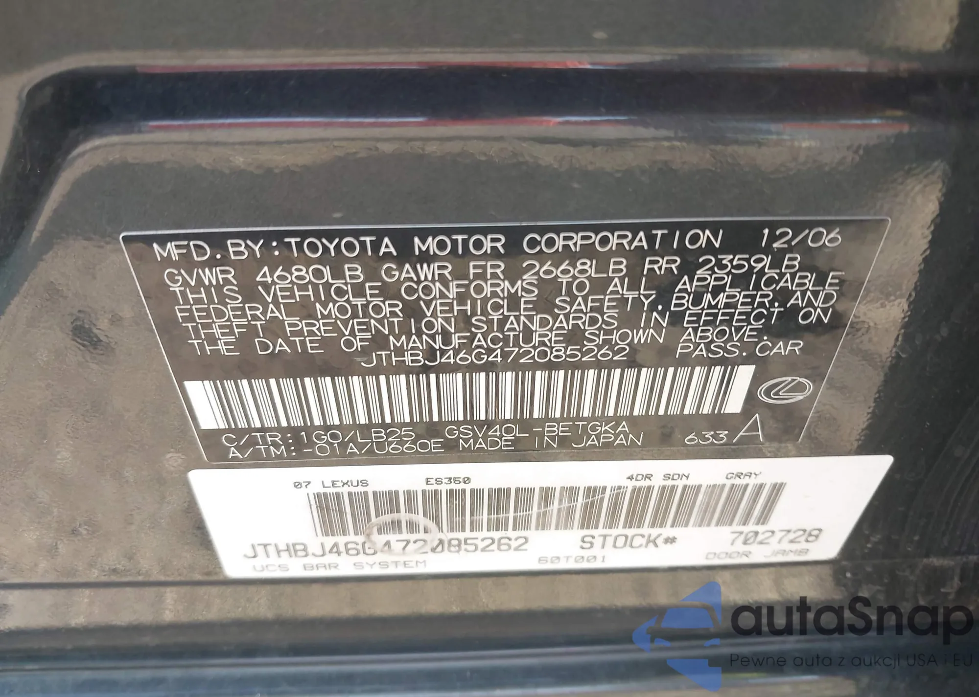 LOT: 40194825 VIN: JTHBJ46G472085262