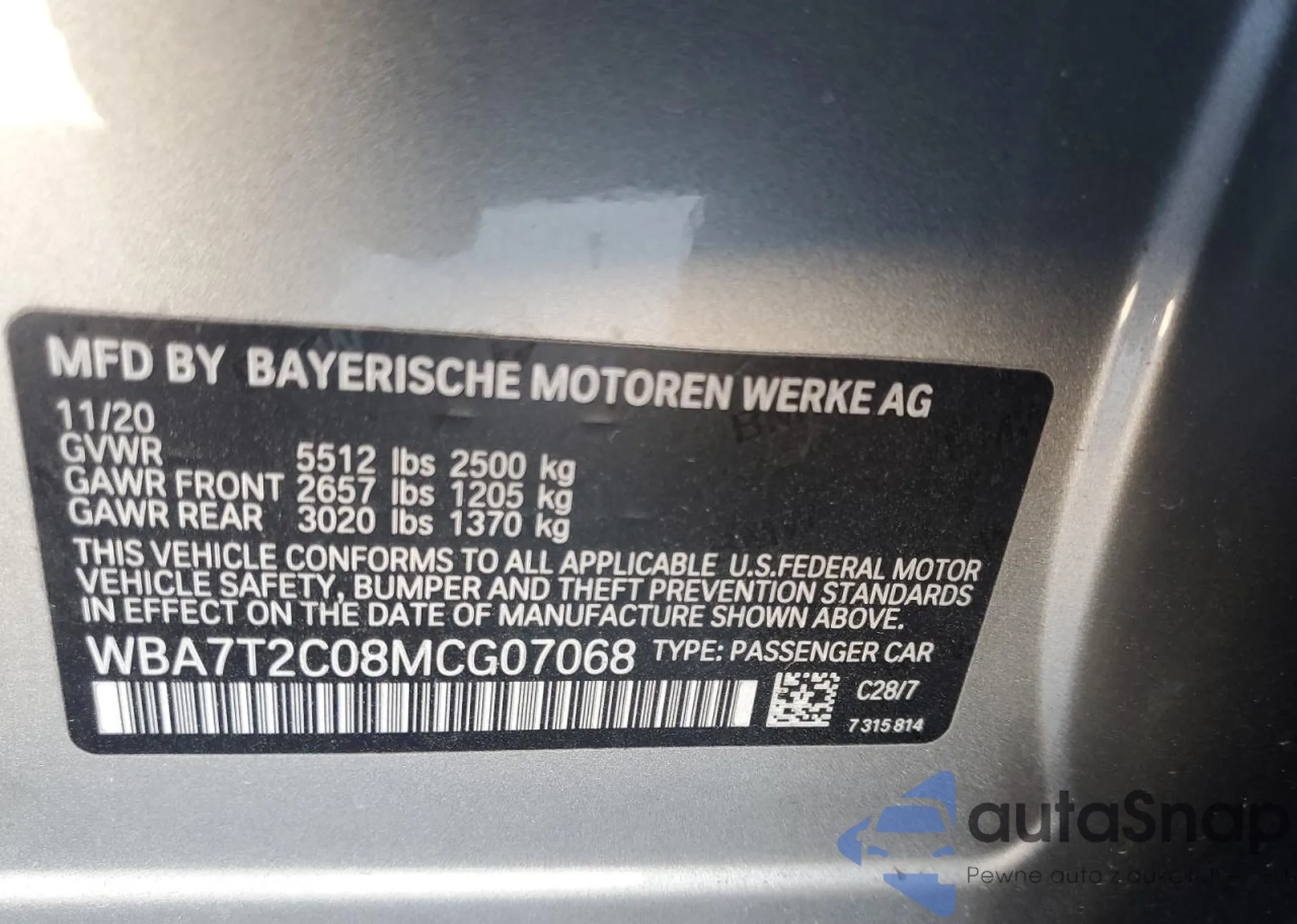 LOT: 83335054 VIN: WBA7T2C08MCG07068