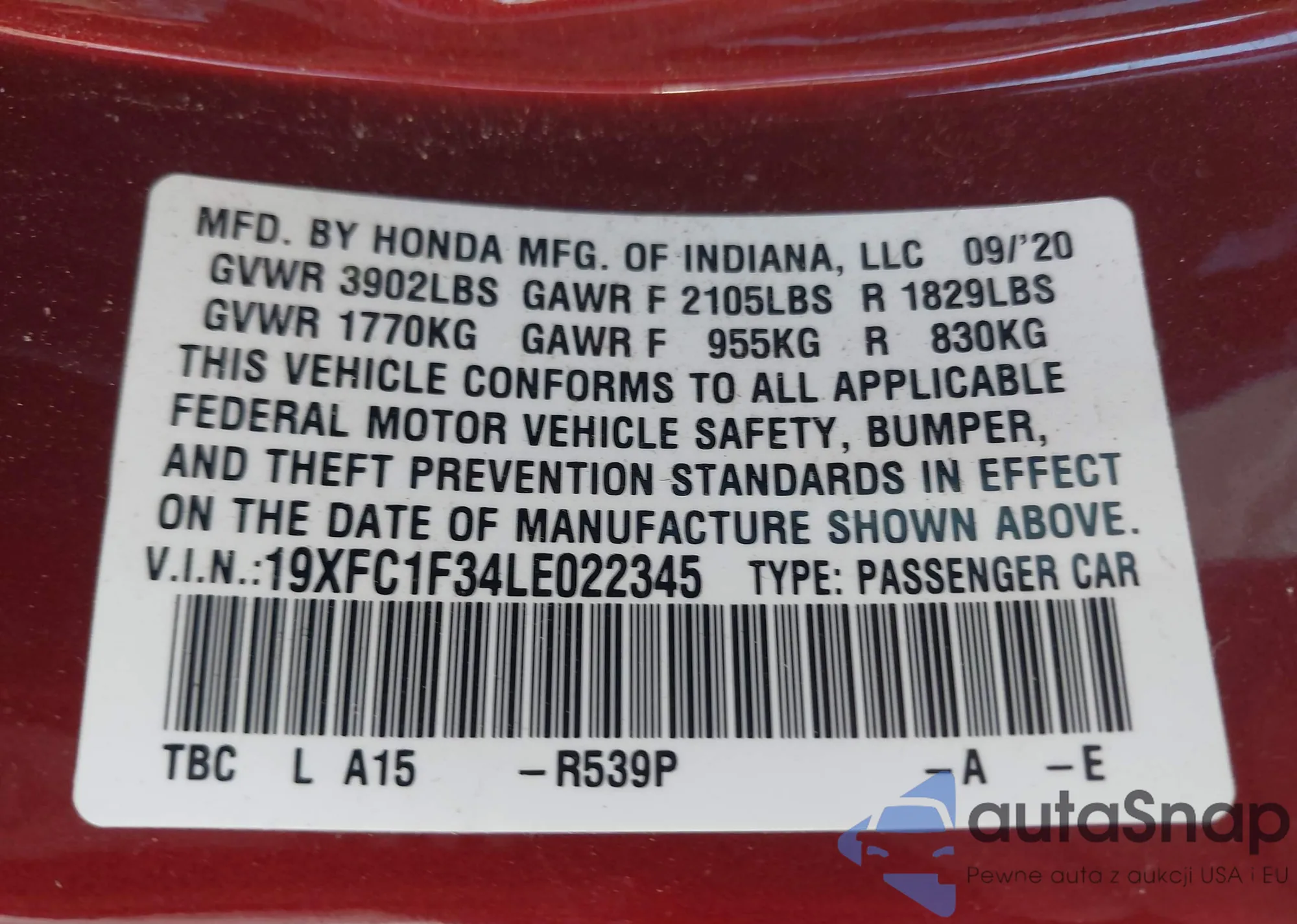 LOT: 40932893 VIN: 19XFL1H83PE015384