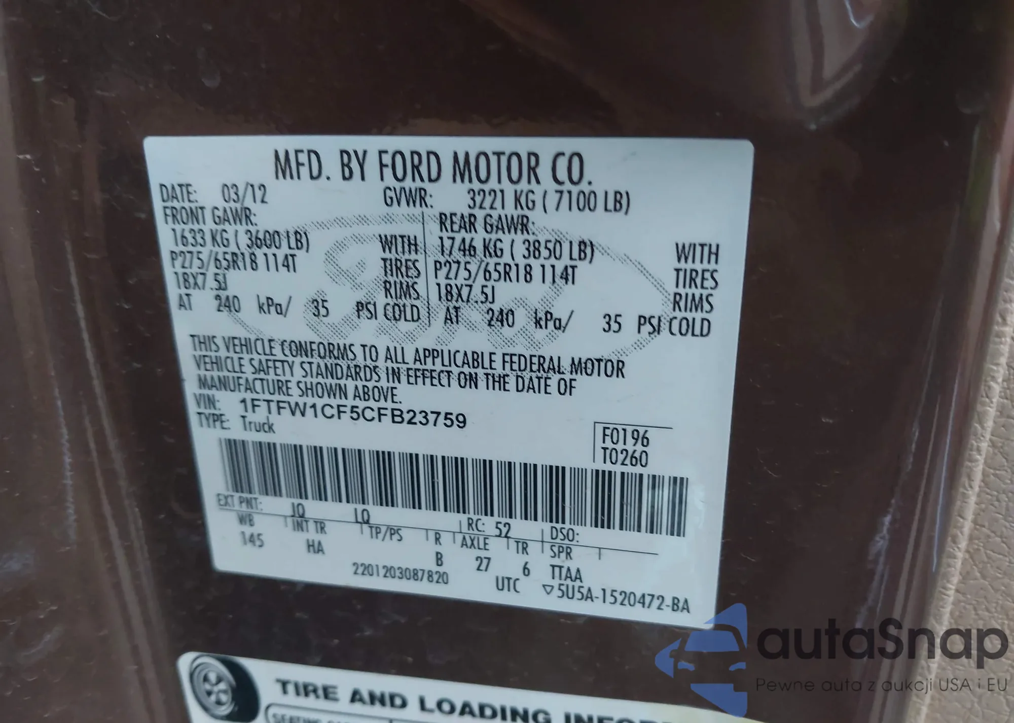 LOT: 40967312 VIN: 1FTFW1CF5CFB23759
