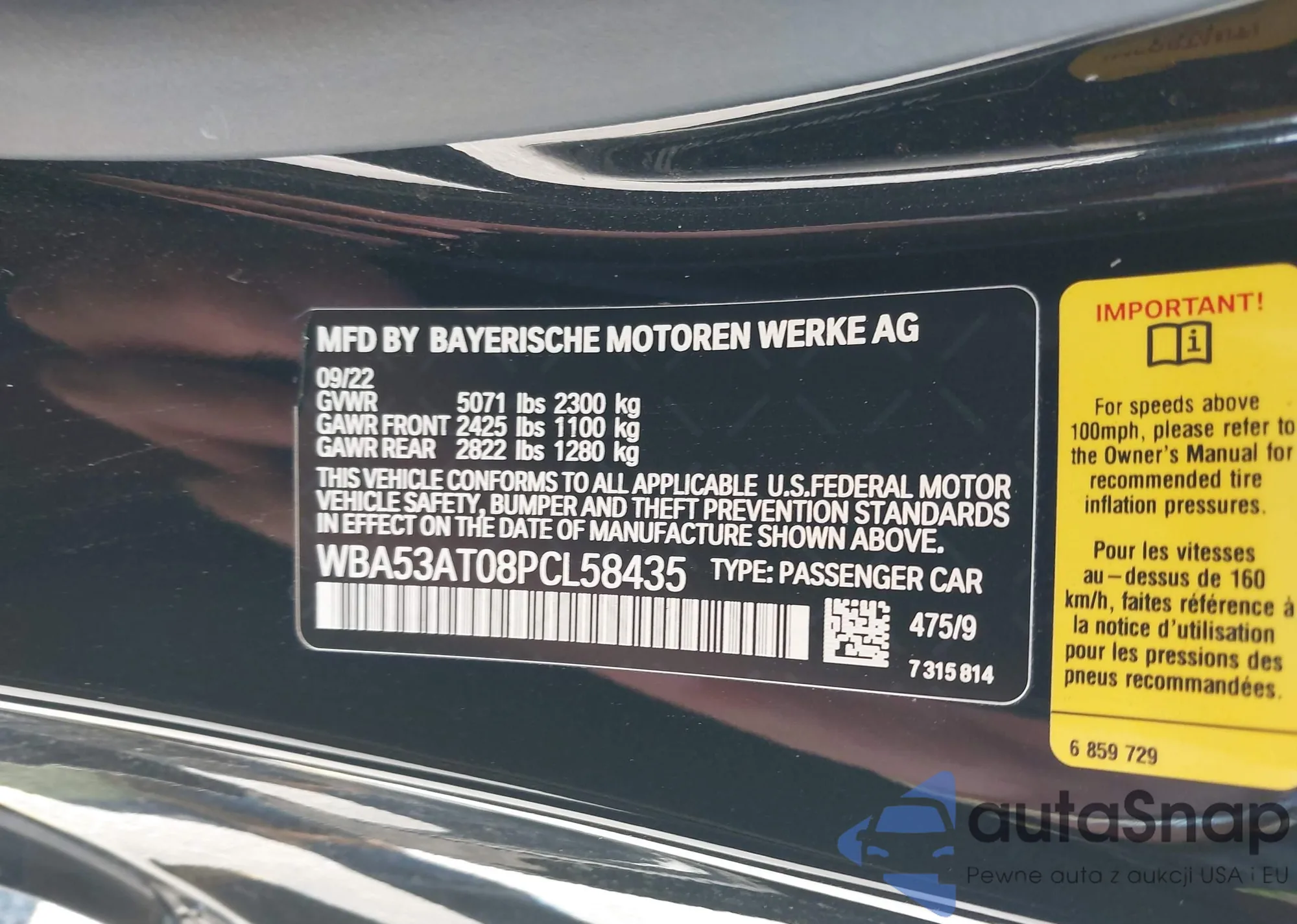 LOT: 41218887 VIN: WBA53AT08PCL58435