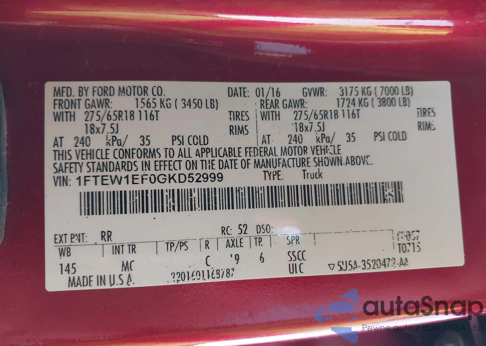 LOT: 40562733 VIN: 1FTEW1EF0GKD52999