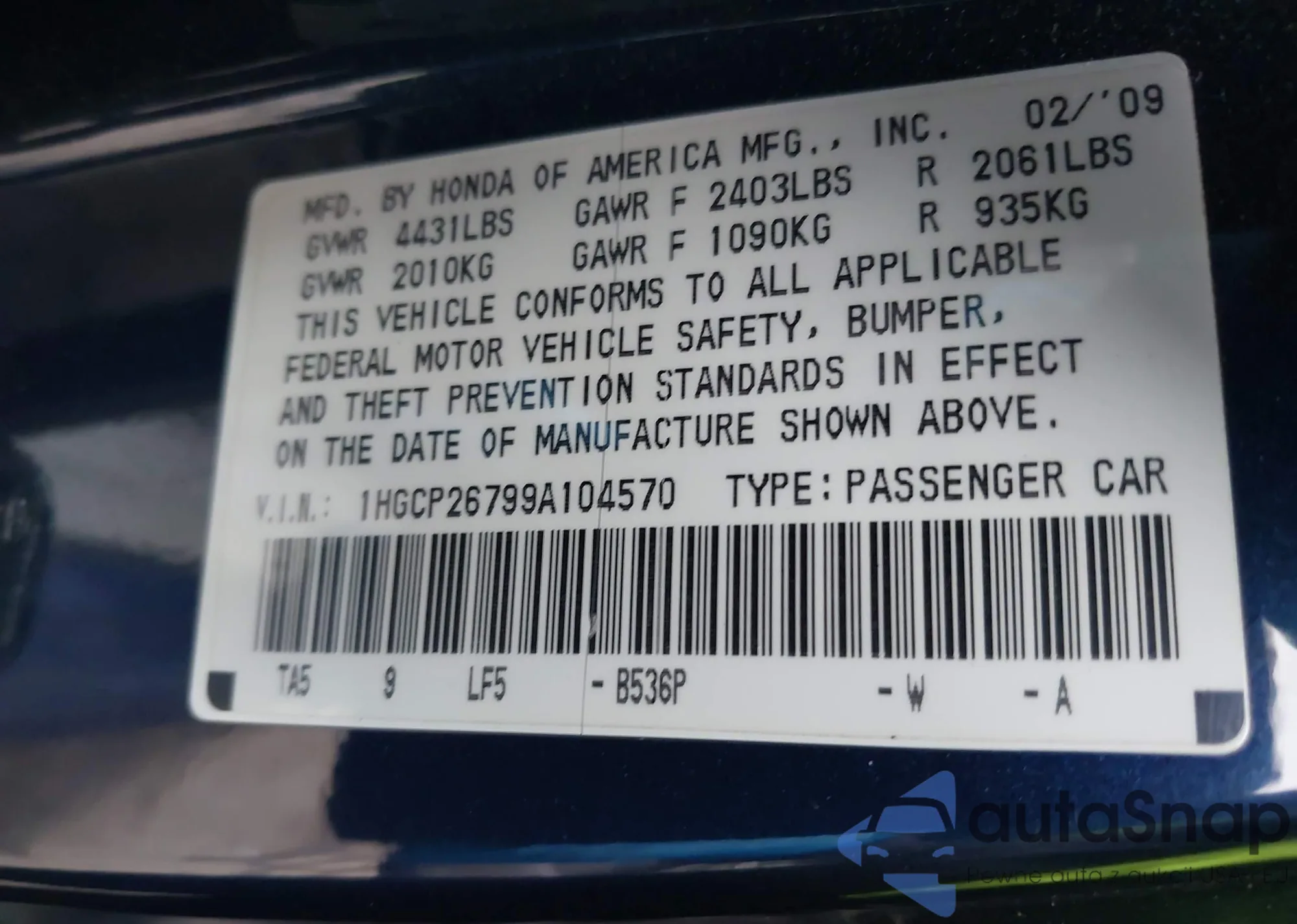 • VIN 1HGCP26799A104570