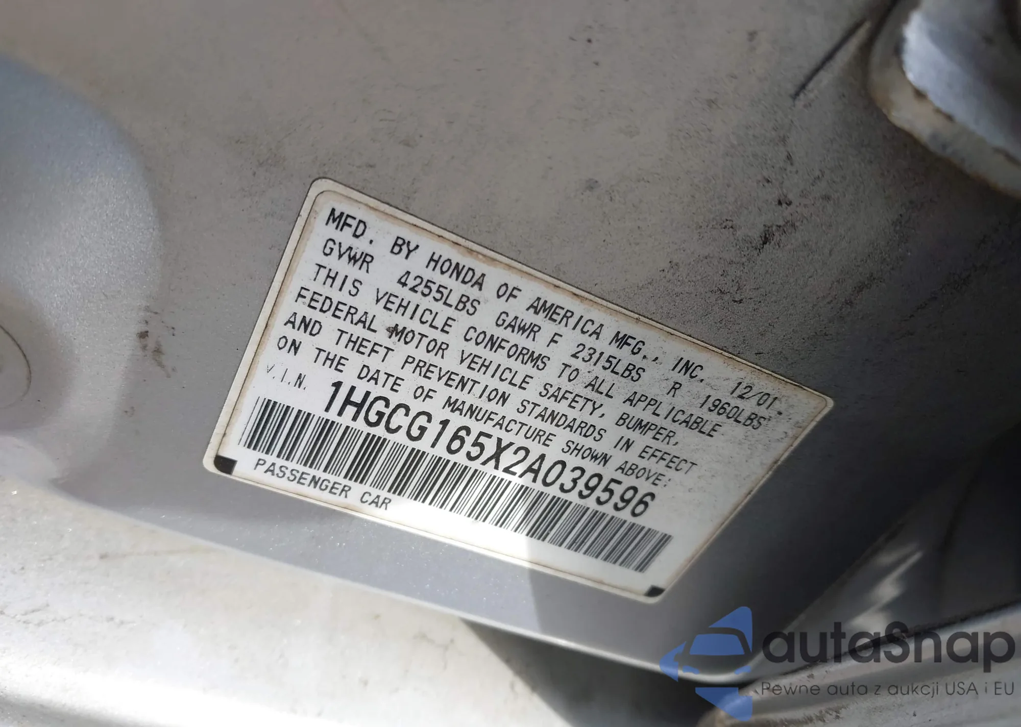 LOT: 41388828 VIN: 1HGCG165X2A039596
