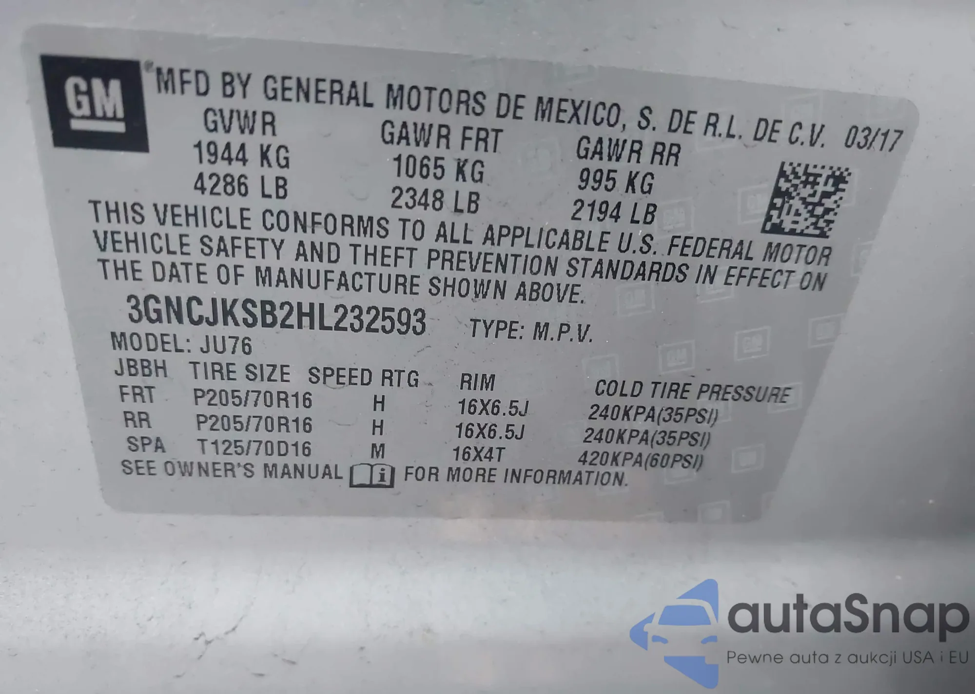 • VIN 3GNCJKSB2HL232593