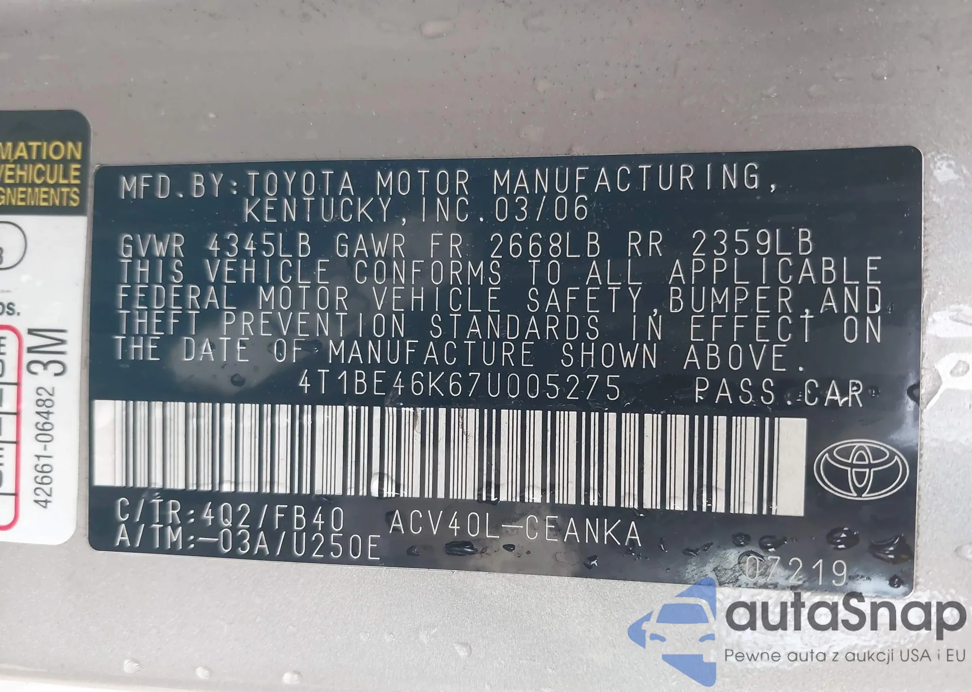 • VIN 4T1BE46K67U005275