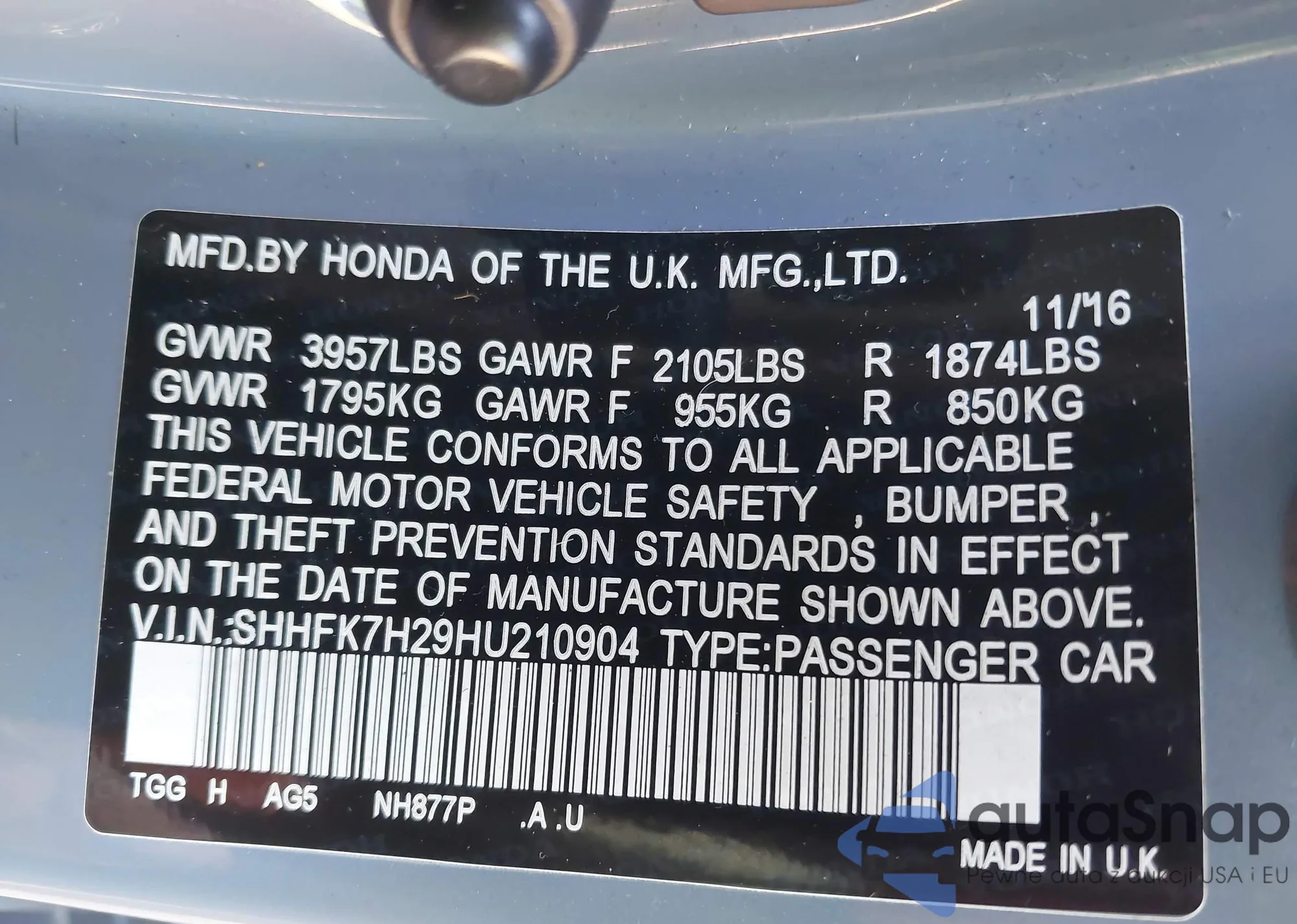 LOT: 40747487 VIN: SHHFK7H29HU210904