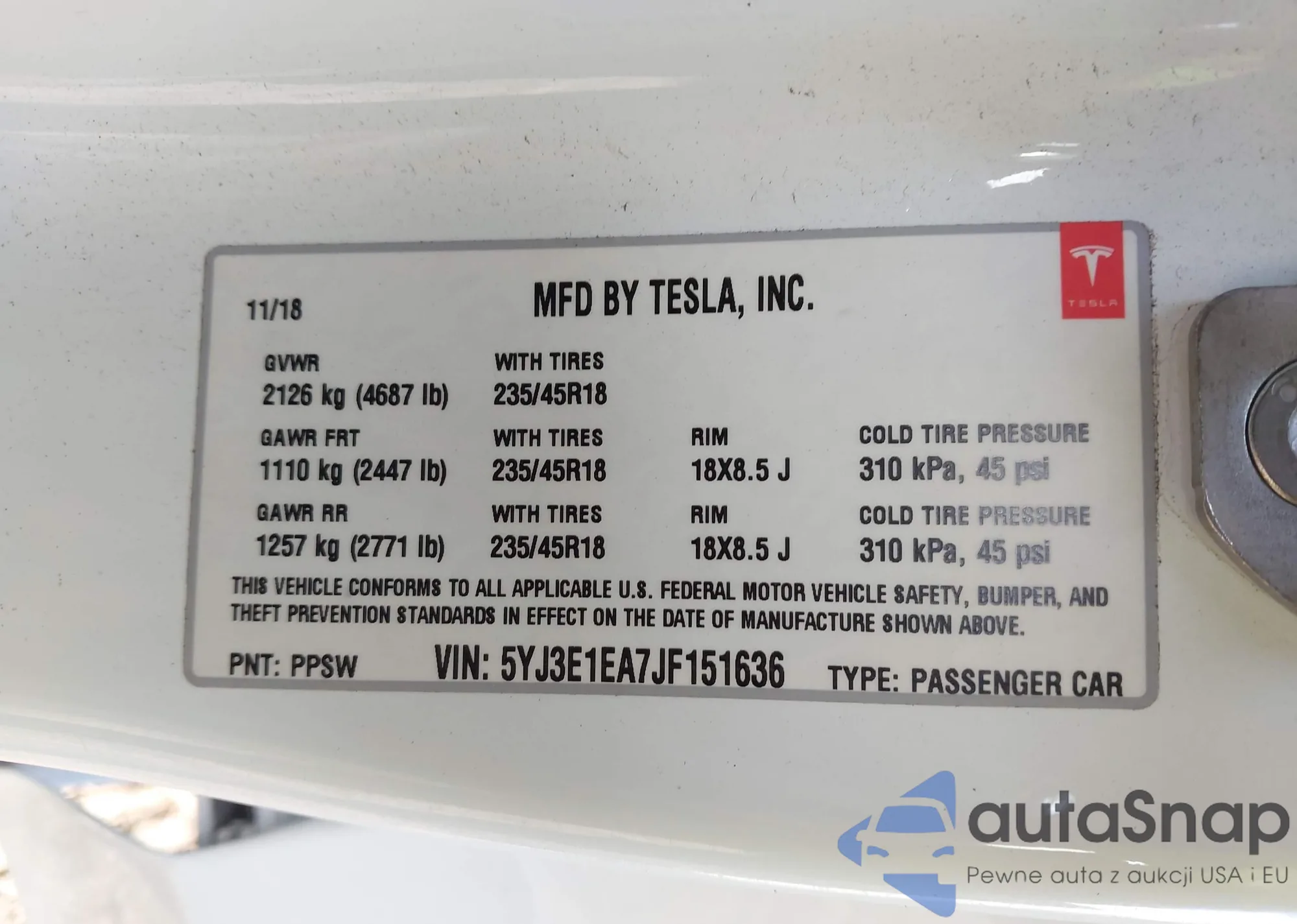 • VIN 5YJ3E1EA7JF151636