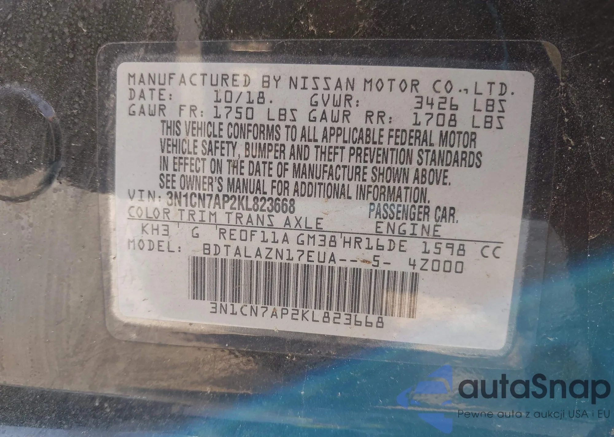 LOT: 39202677 VIN: 3N1CN7AP2KL823668