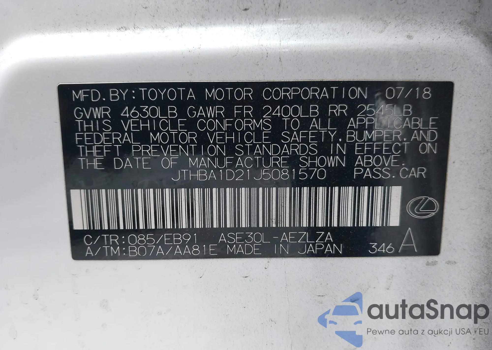 LOT: 41173295 VIN: JTHBA1D21J5081570