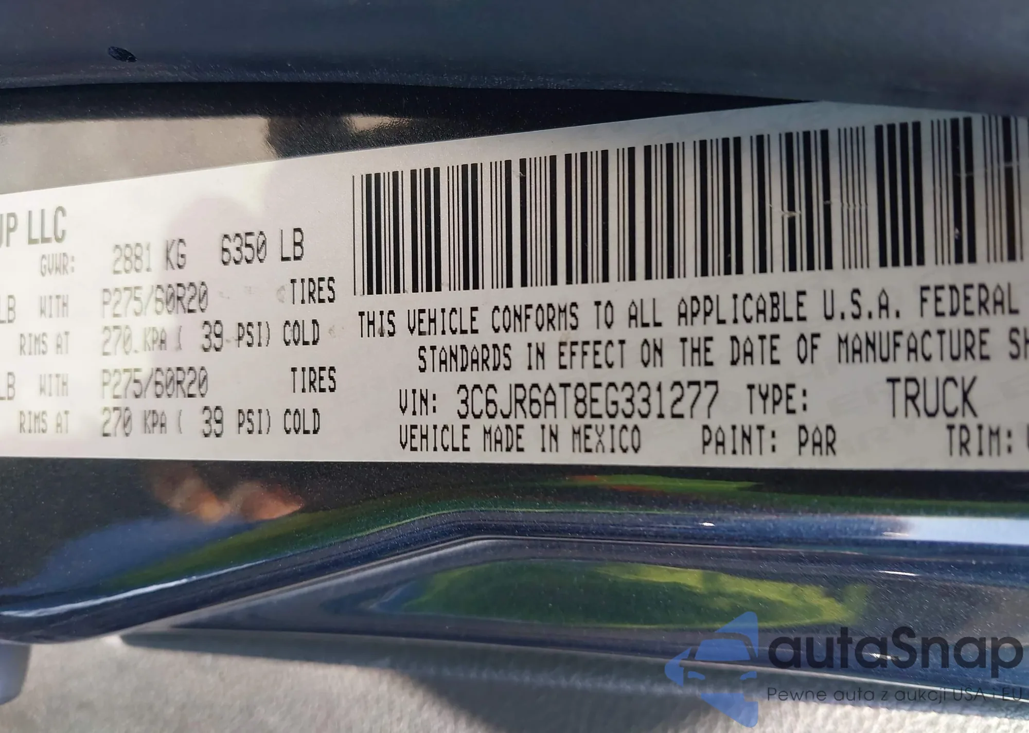 • VIN 3C6JR6AT8EG331277