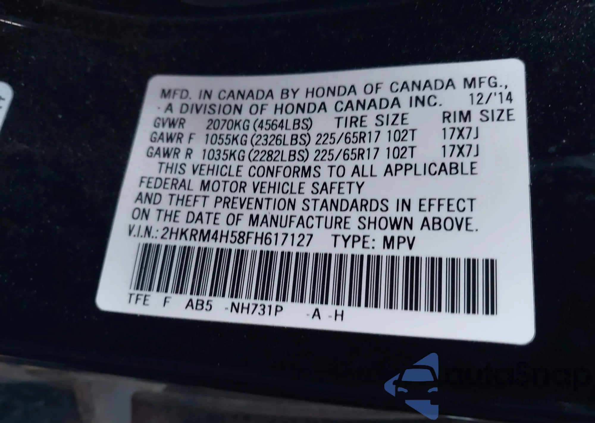 • VIN 2HKRM4H58FH617127