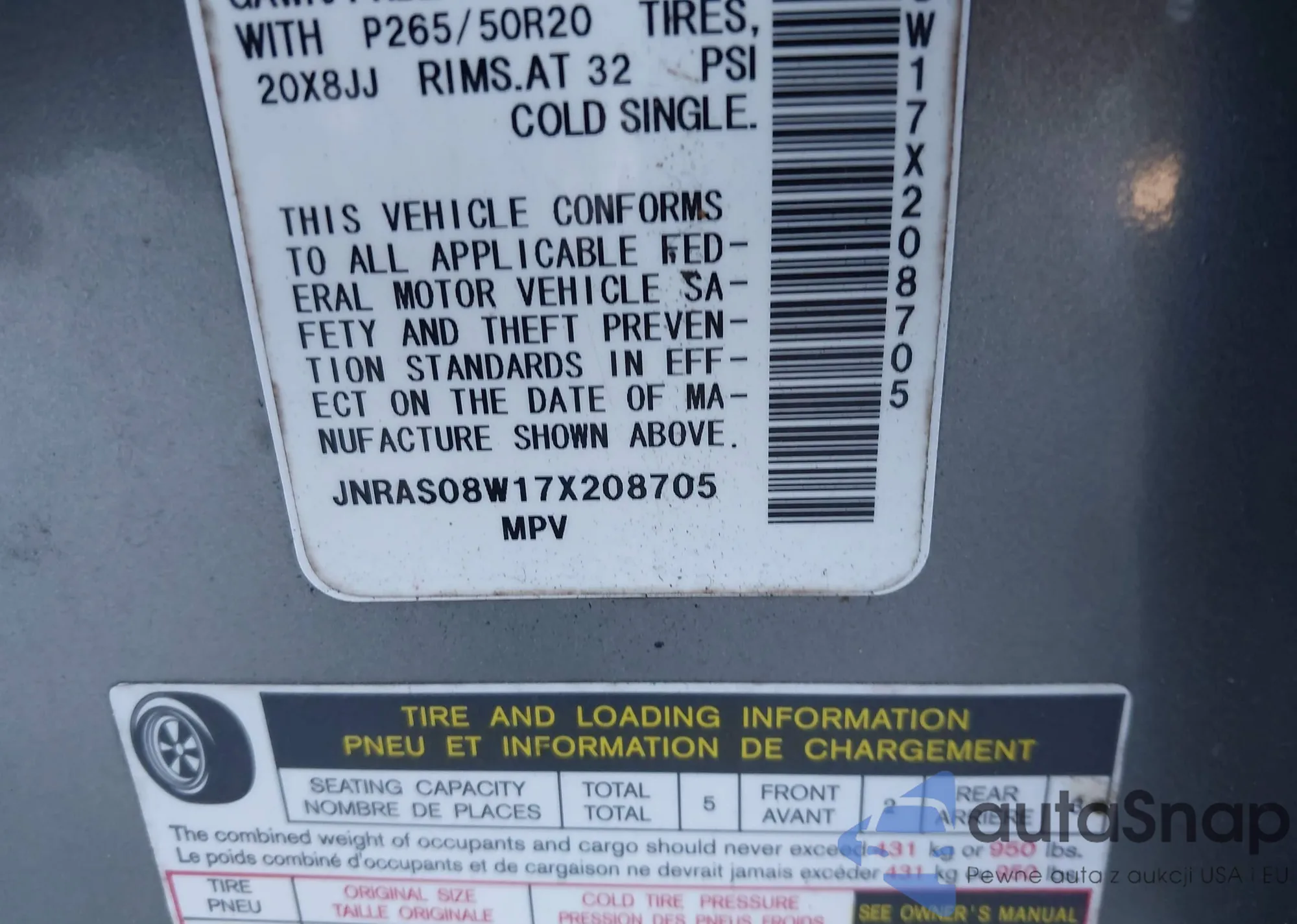 LOT: 41114370 VIN: JNRAS08W17X208705
