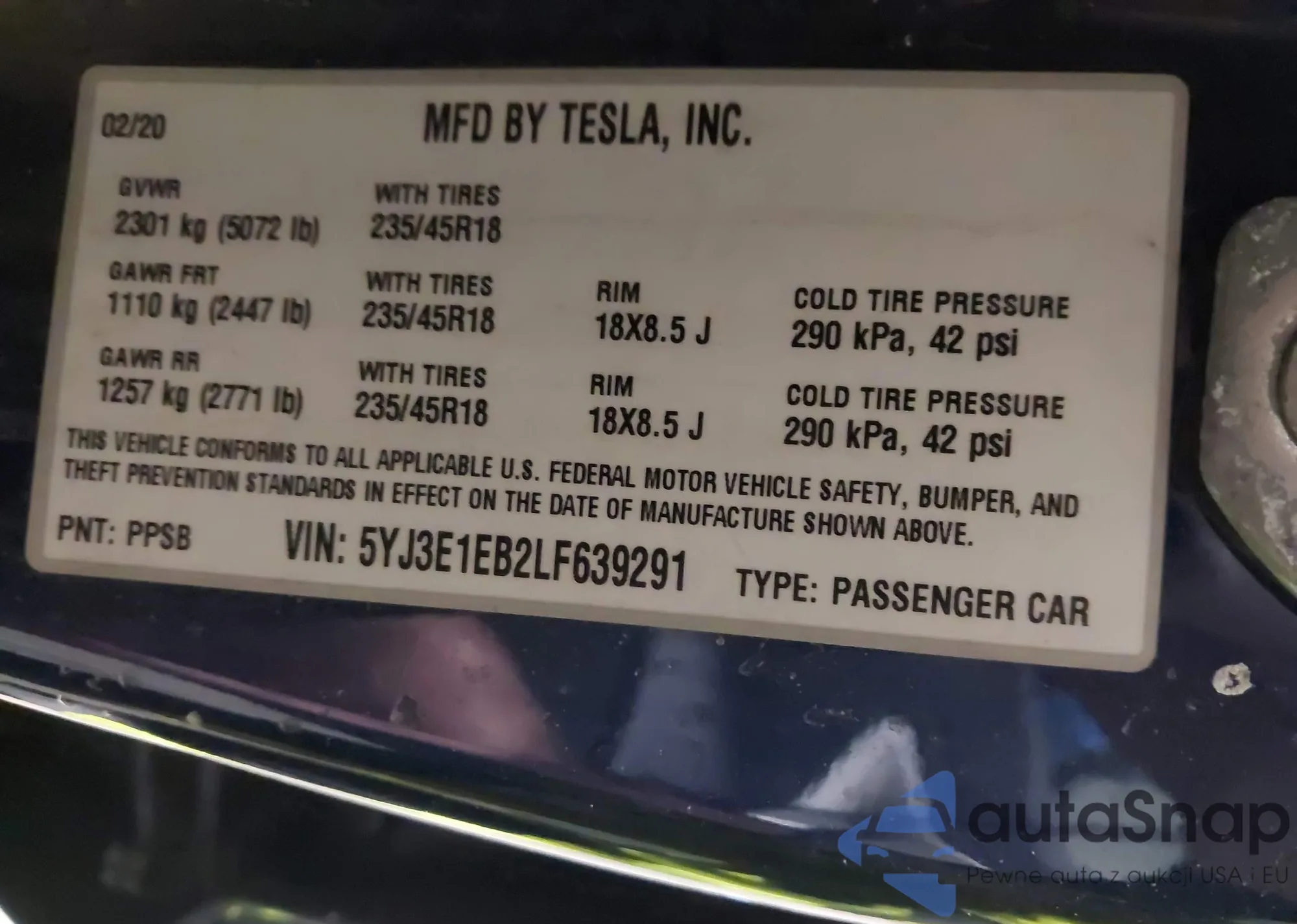 • VIN 5YJ3E1EB2LF639291