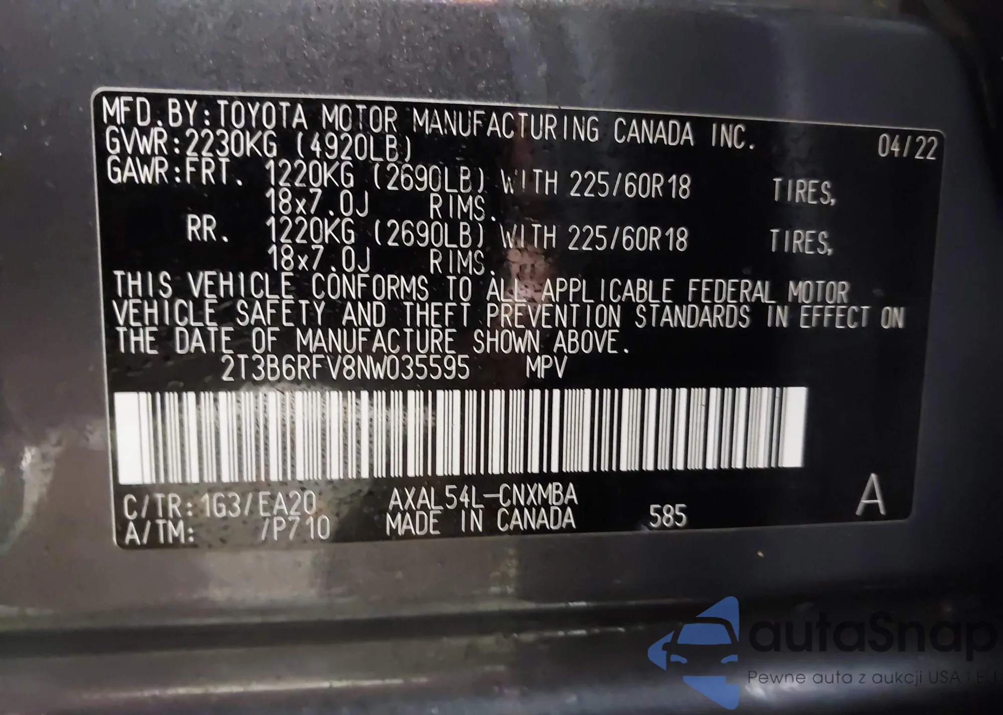 • VIN 2T3B6RFV8NW035595