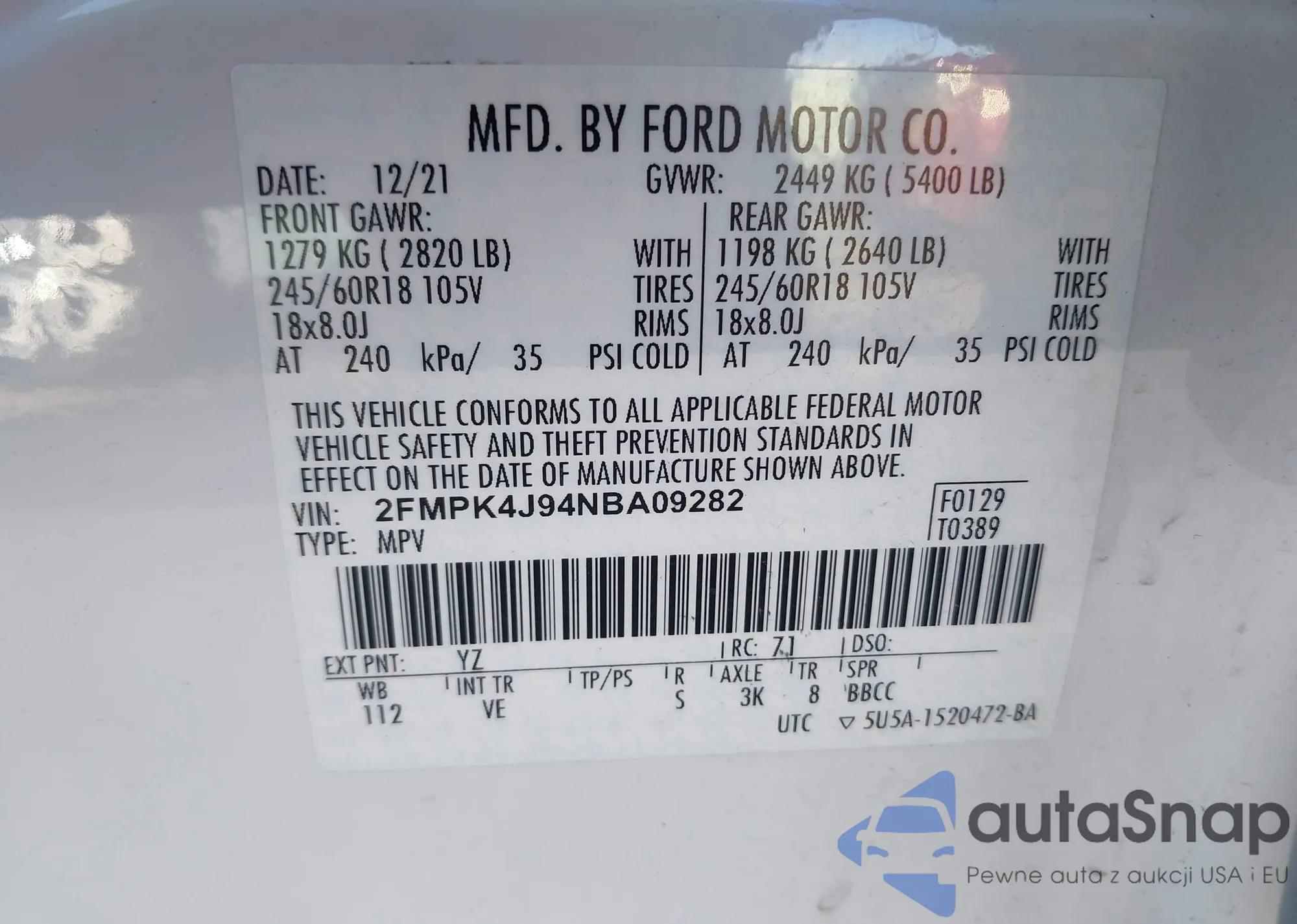 LOT: 41340957 VIN: 1FMHK7D83CGA21602