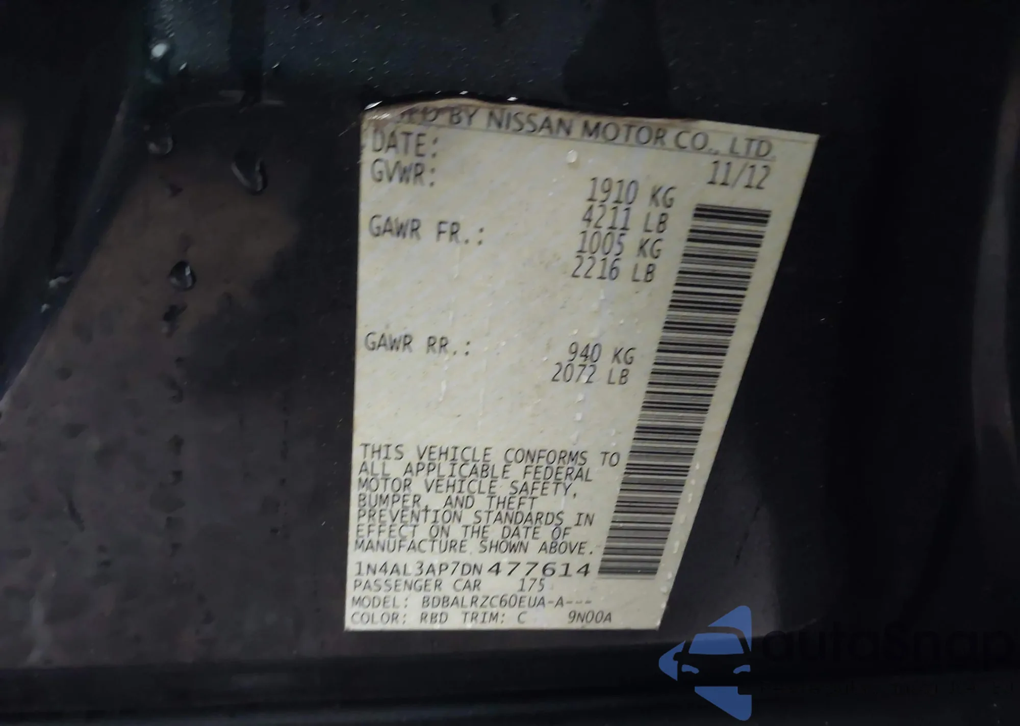 • VIN 1N4AL3AP7DN477614