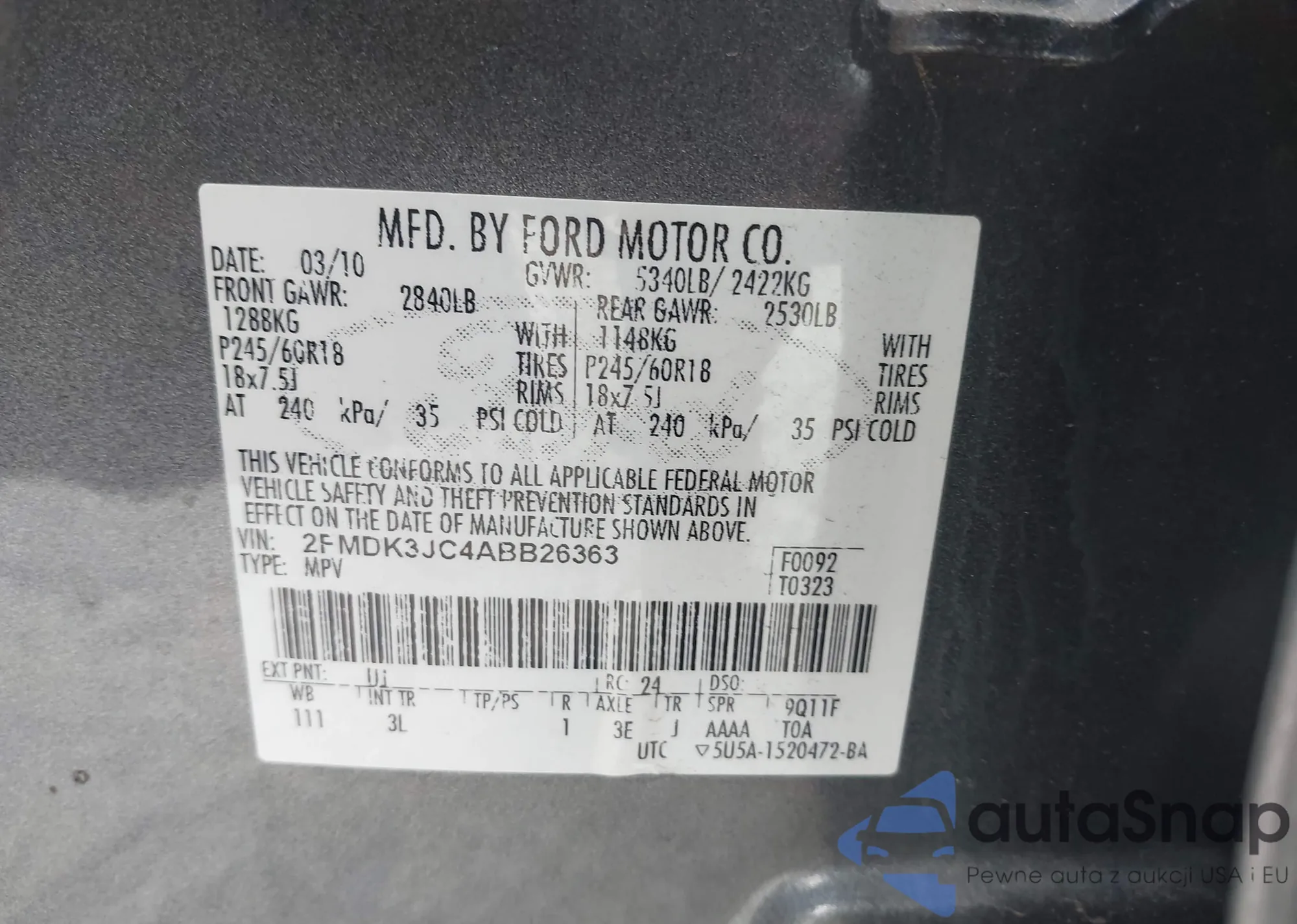 LOT: 41507918 VIN: 2FMDK3JC4ABB26363