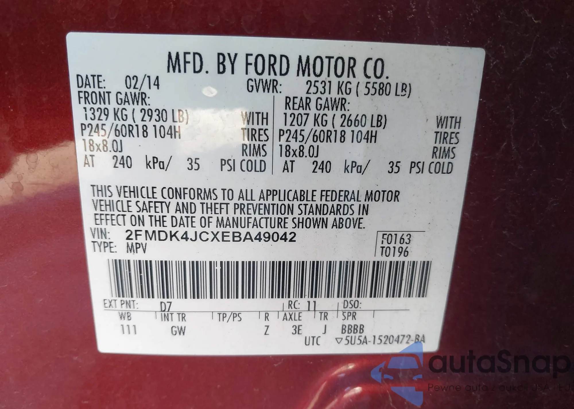 LOT: 41195381 VIN: 2FMDK4JCXEBA49042