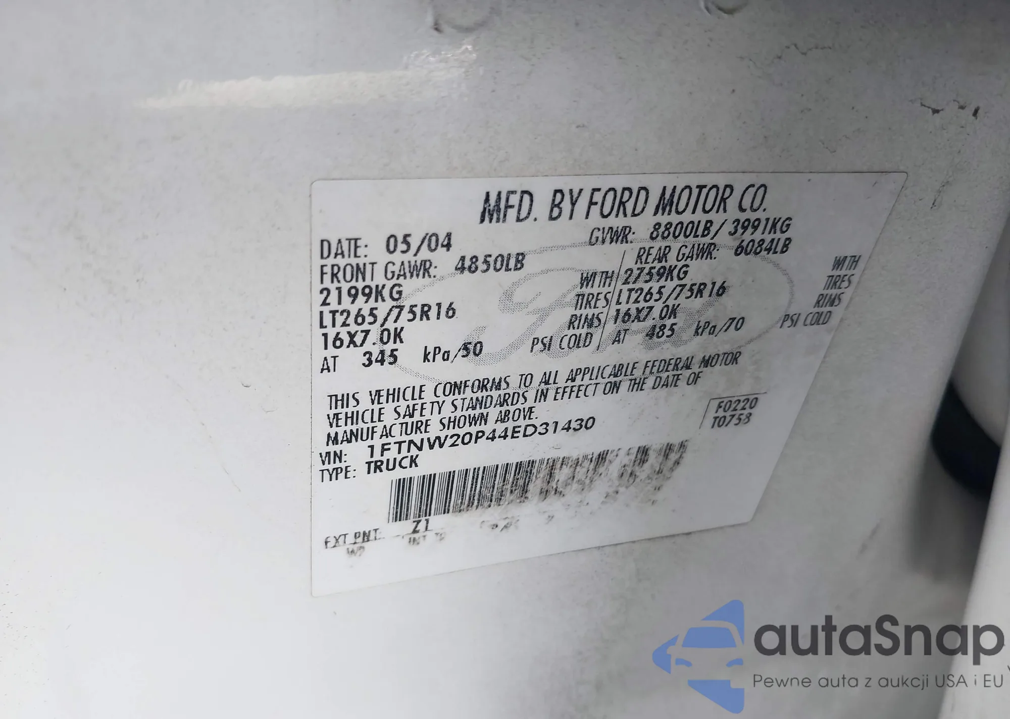 • VIN 1FTNW20P44ED31430
