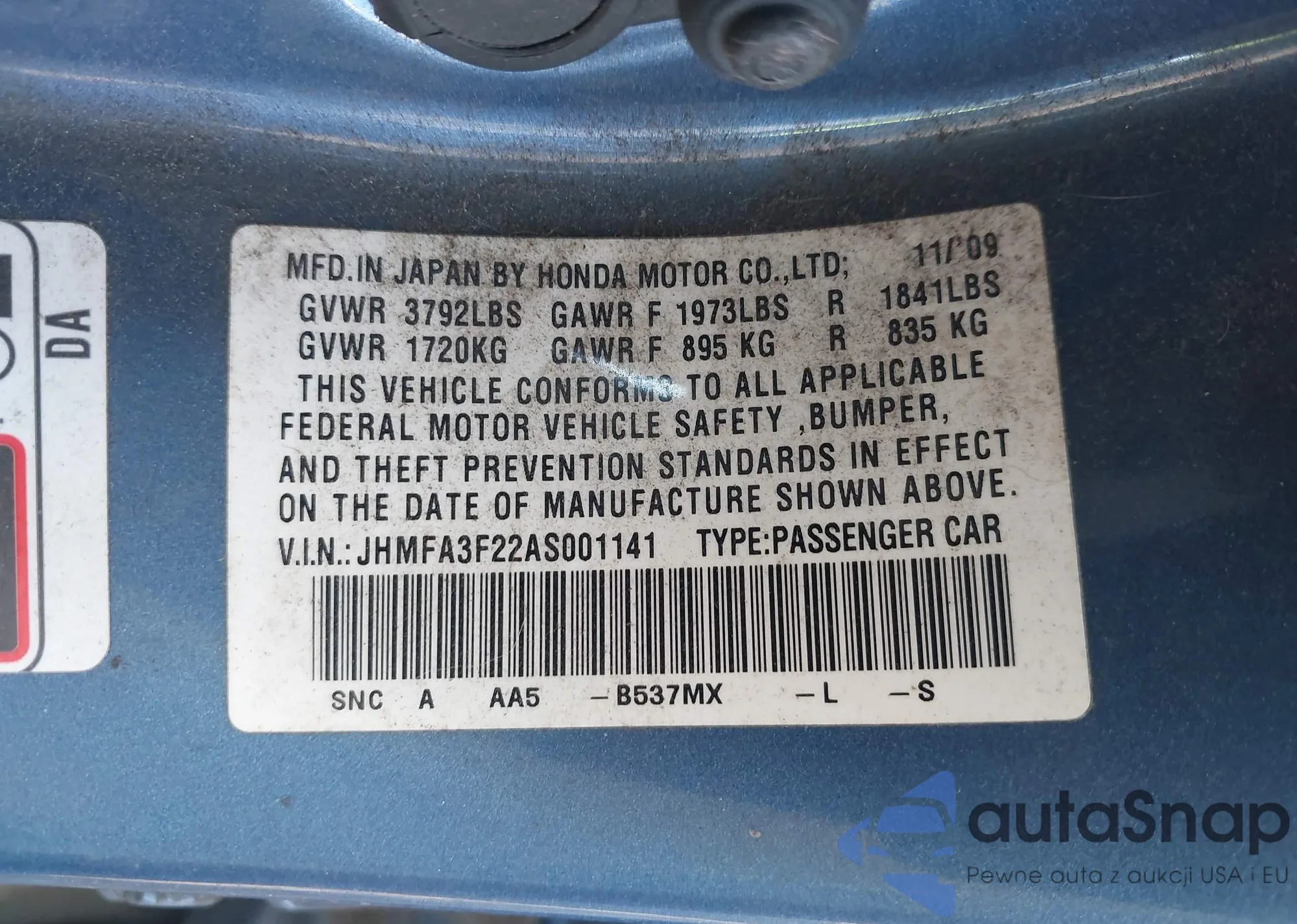 • VIN JHMFA3F22AS001141