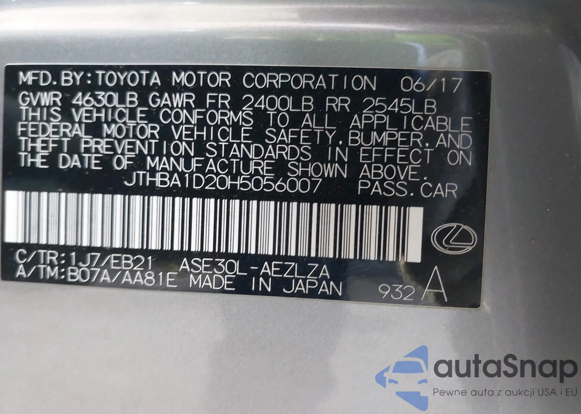 • VIN JTHBA1D20H5056007