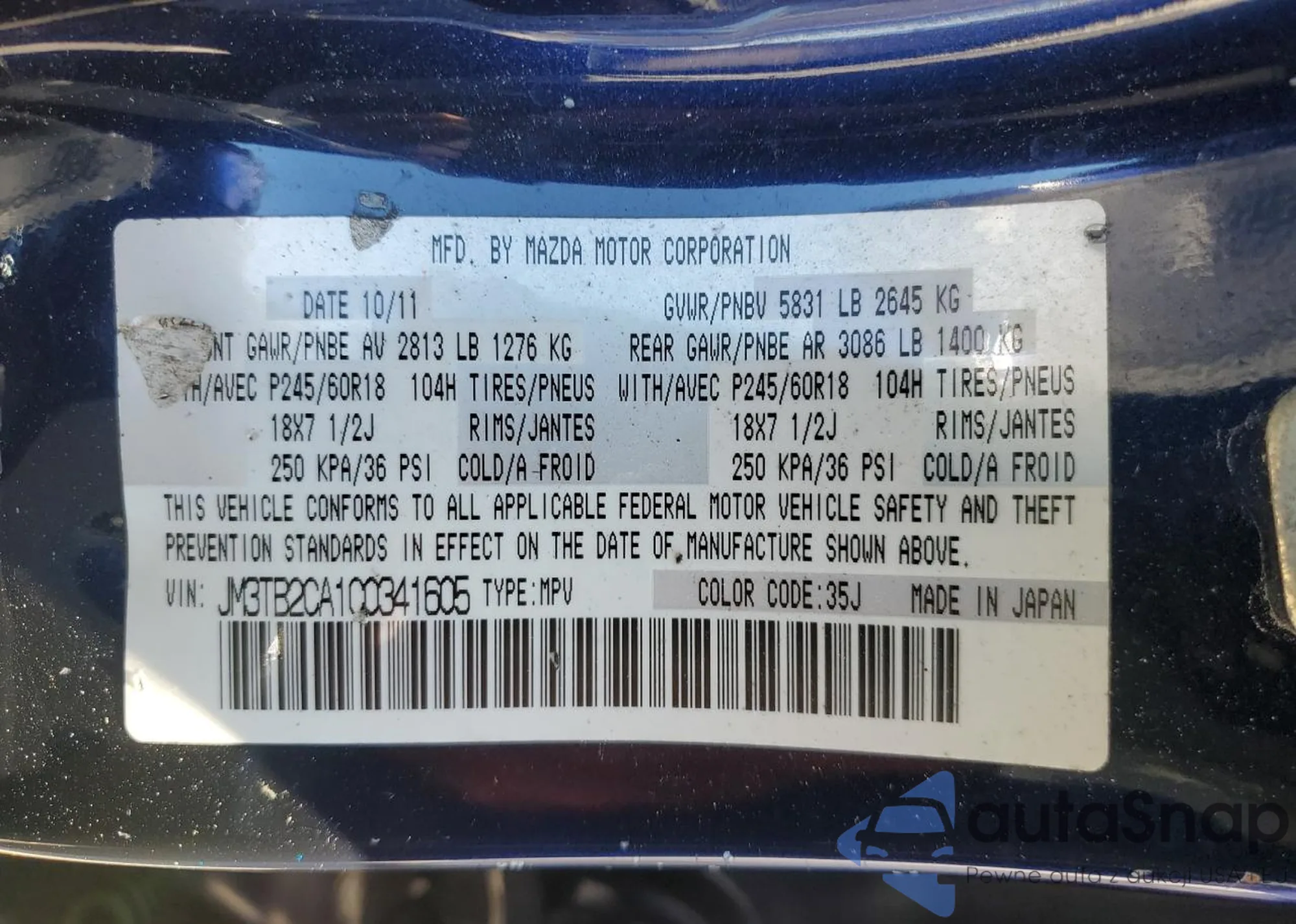 • VIN 1HGCR3F87DA029126