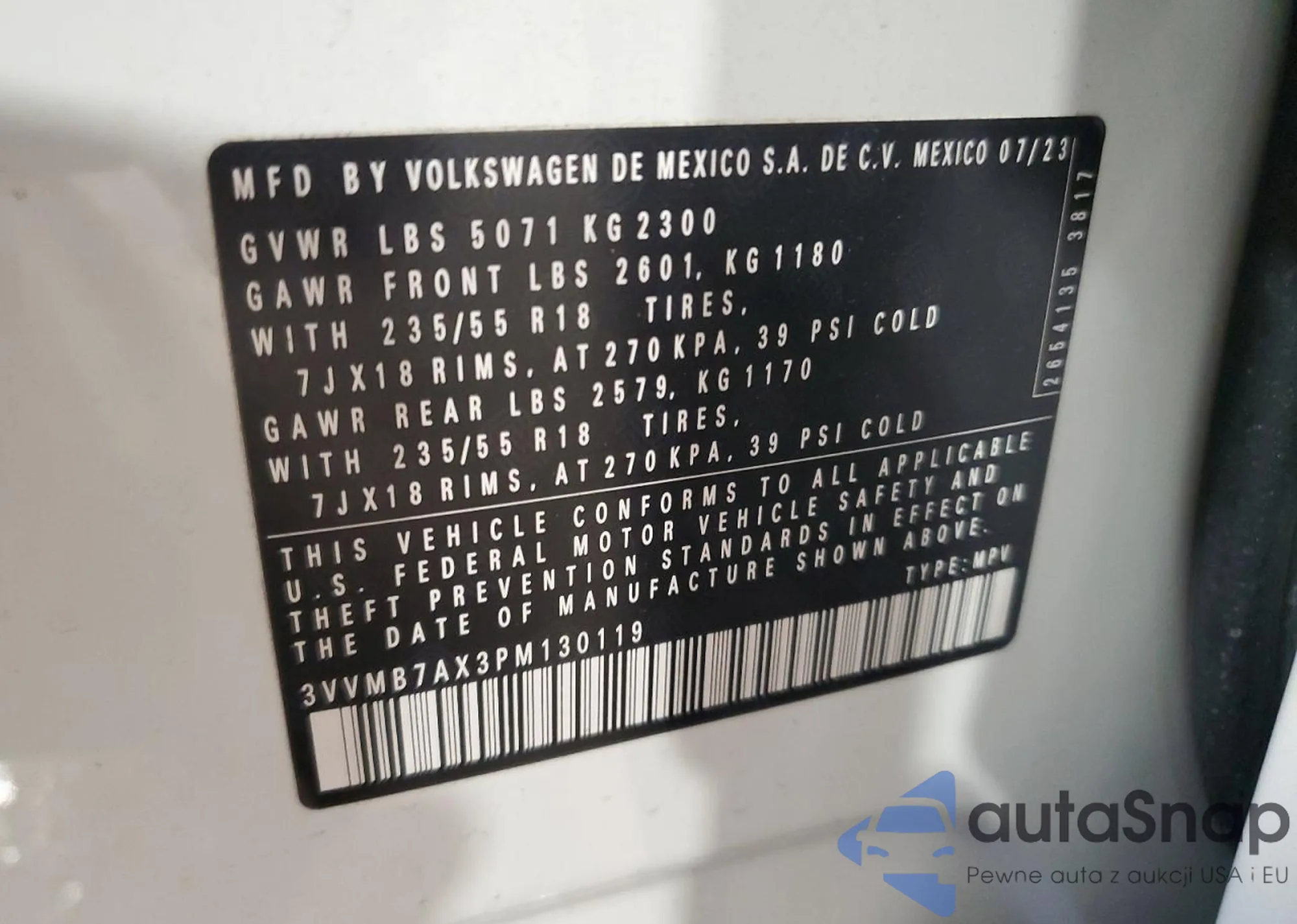 • VIN 3VVMB7AX3PM130119