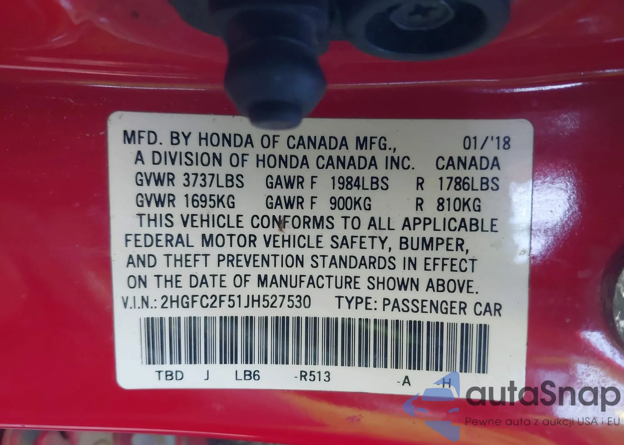 • VIN 2HGFC2F51JH527530