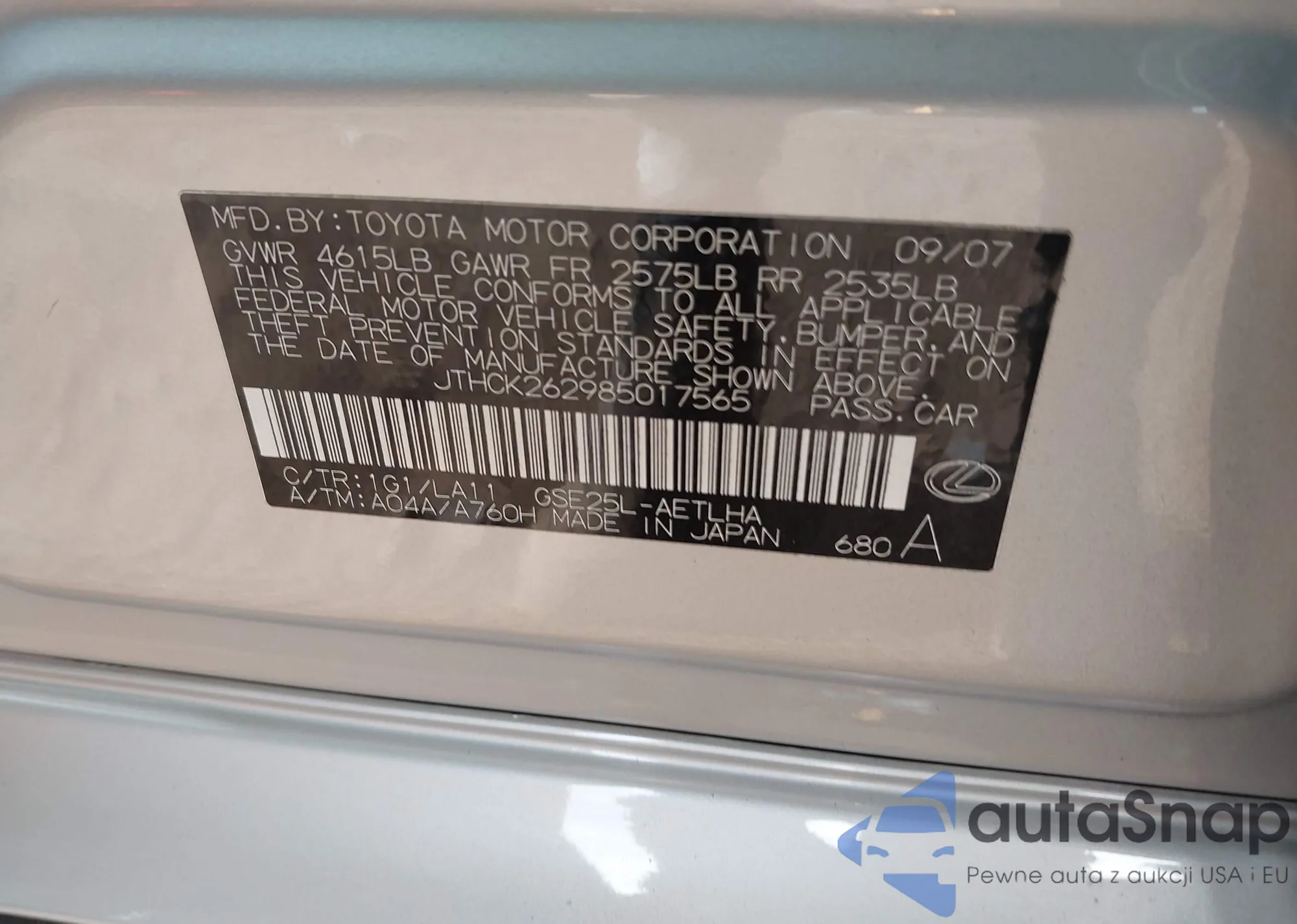 LOT: 41283936 VIN: JTHCK262985017565