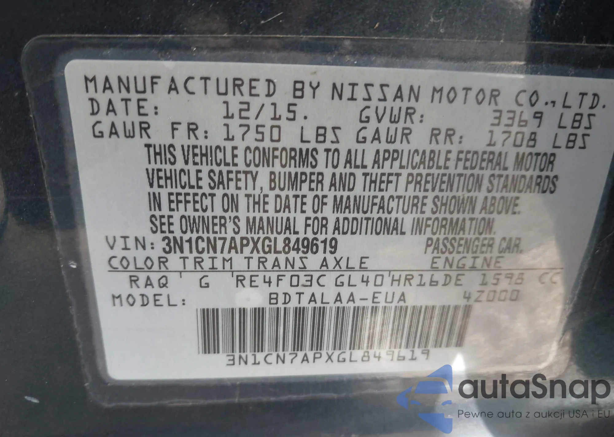 • VIN 3N1CN7APXGL849619