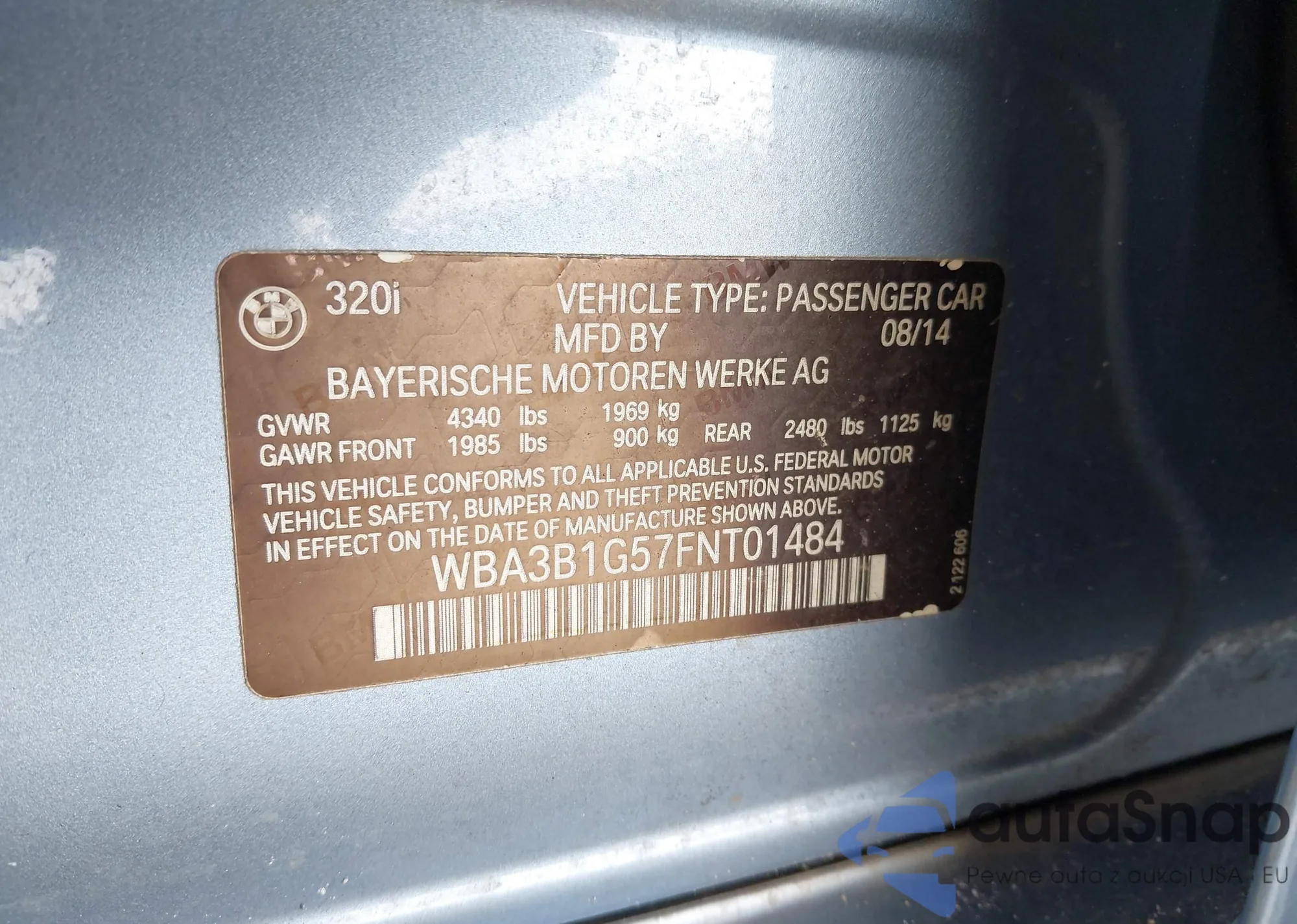 2015 BMW 320I из США, поврежденный, VIN WBA3B1G57FNT01484