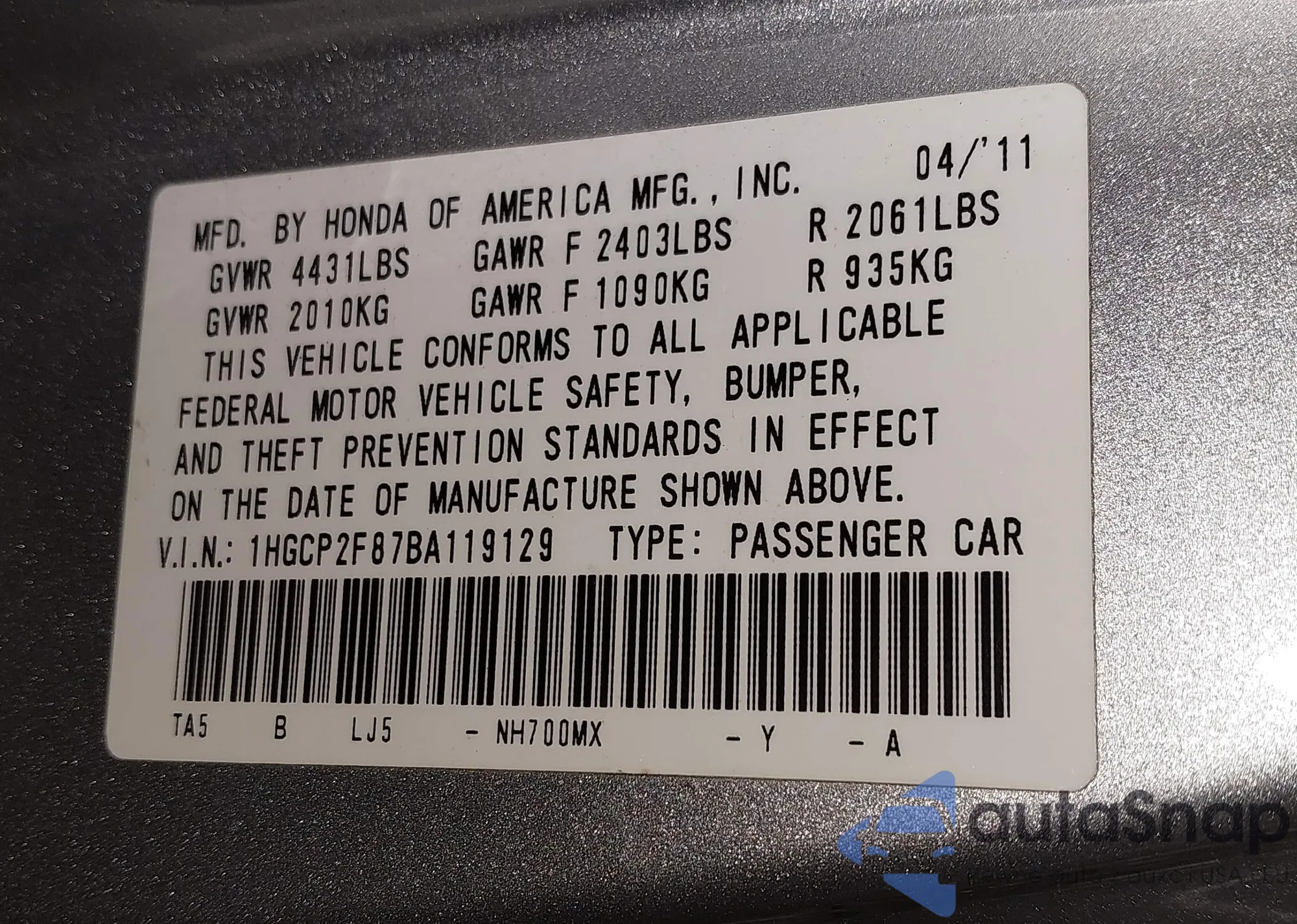 • VIN 1HGCP2F87BA119129
