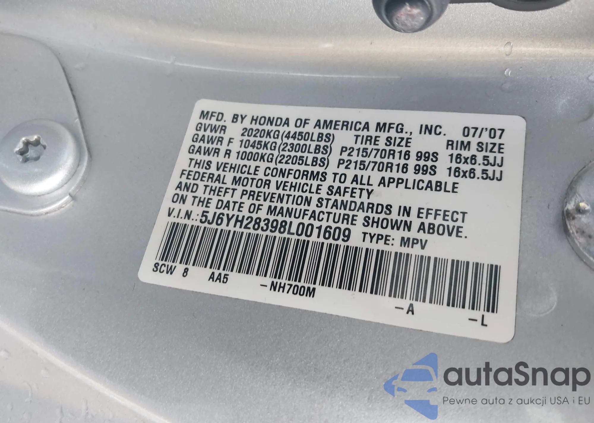• VIN 5J6YH28398L001609