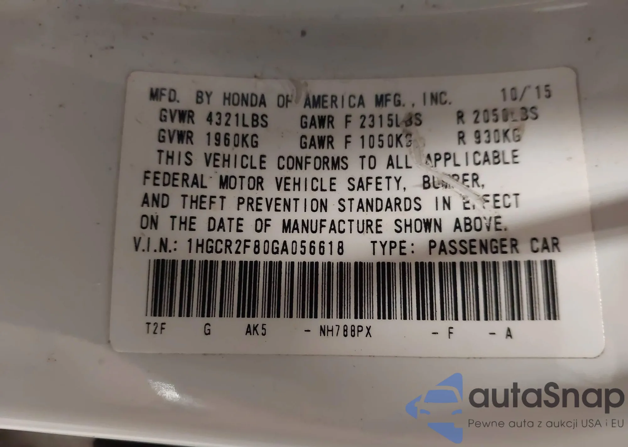 • VIN 1HGCR2F80GA056618