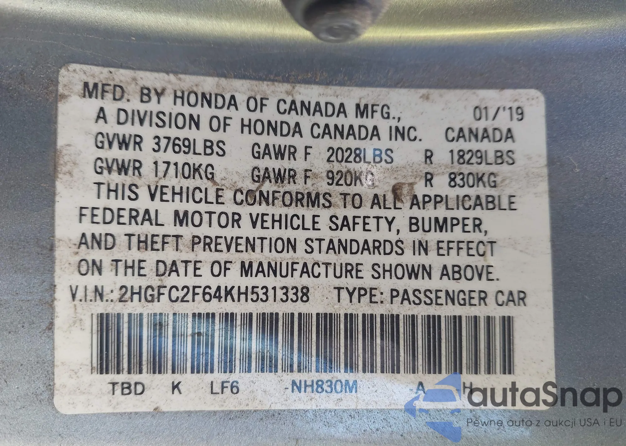 • VIN 2HGFC2F64KH531338