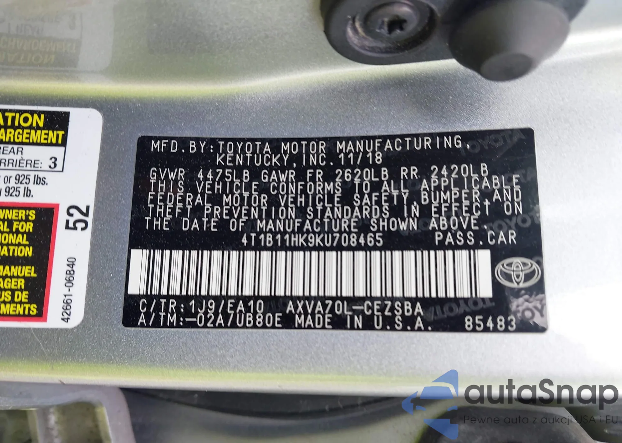 • VIN 4T1B11HK9KU708465